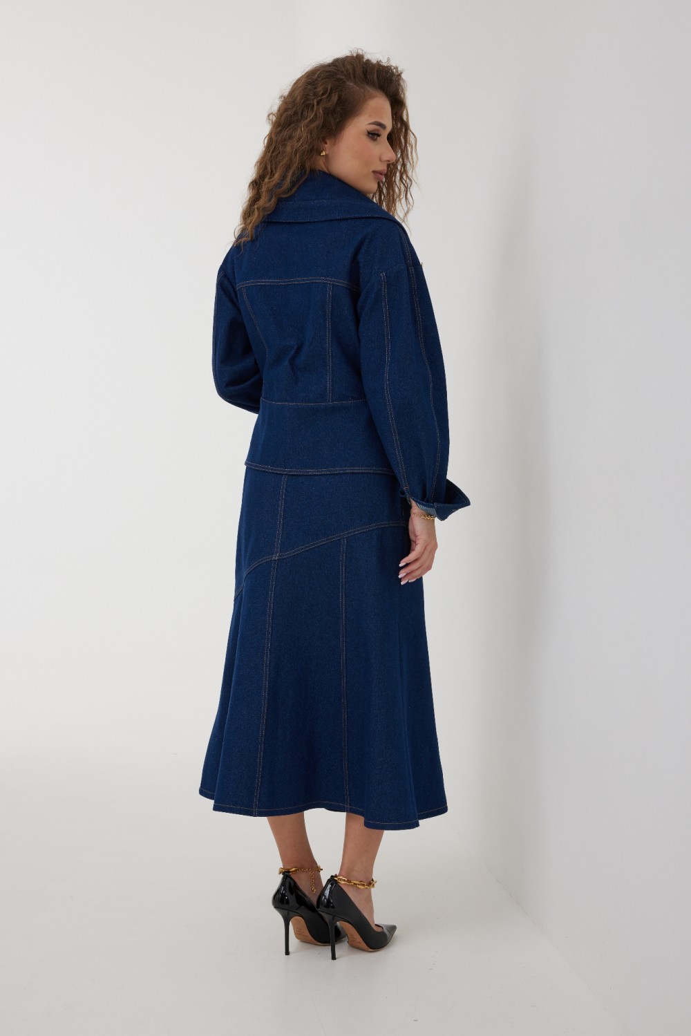 линии бедер. Застежка на планку с петлями и джинсовыми пуговицами. Воротник высокий
