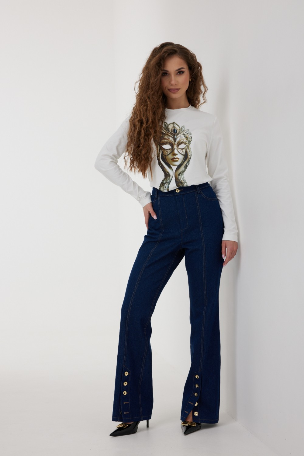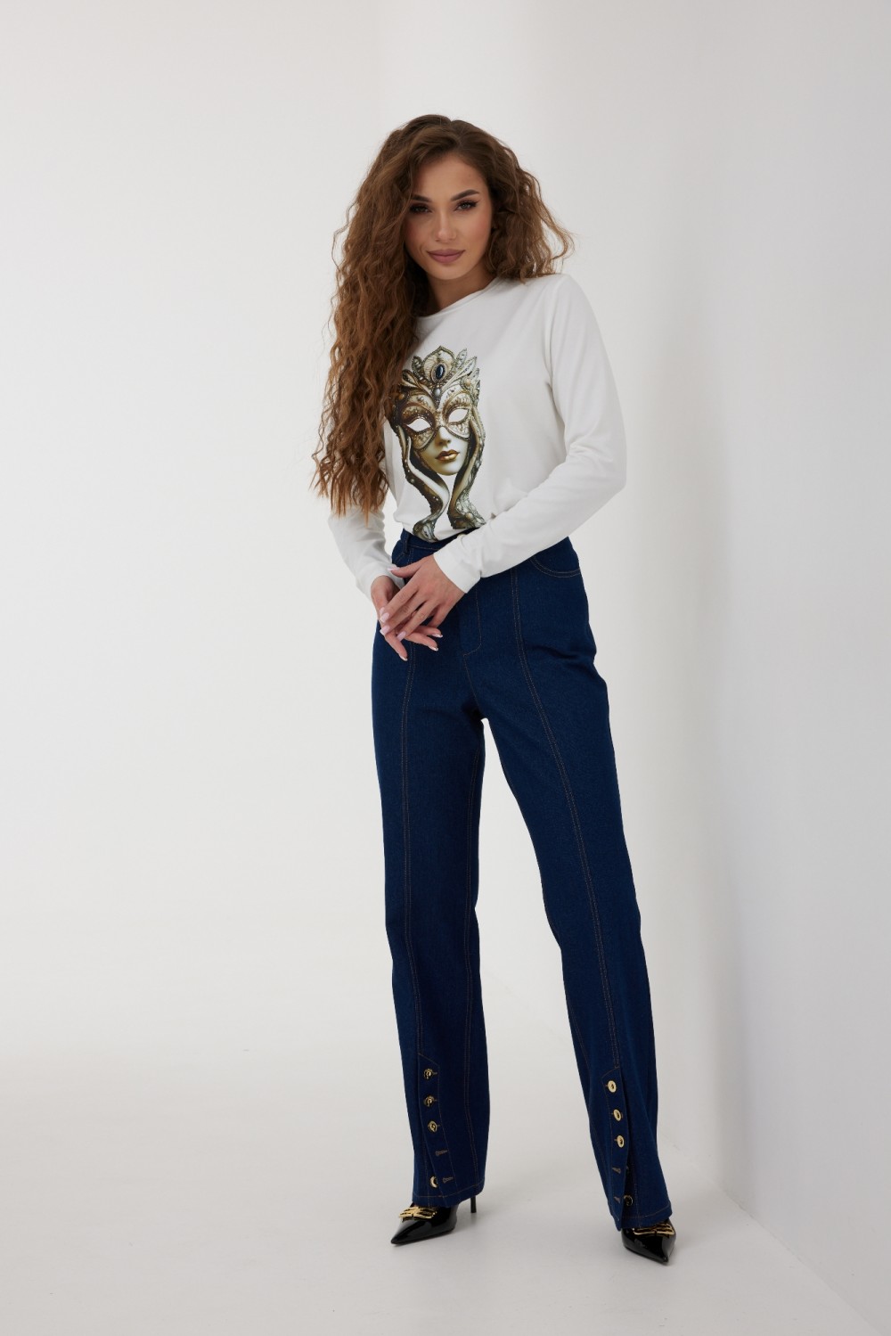 Горловина круглой формы. Рукав прямой удлинённый  с отверстием для большого пальца. На переде