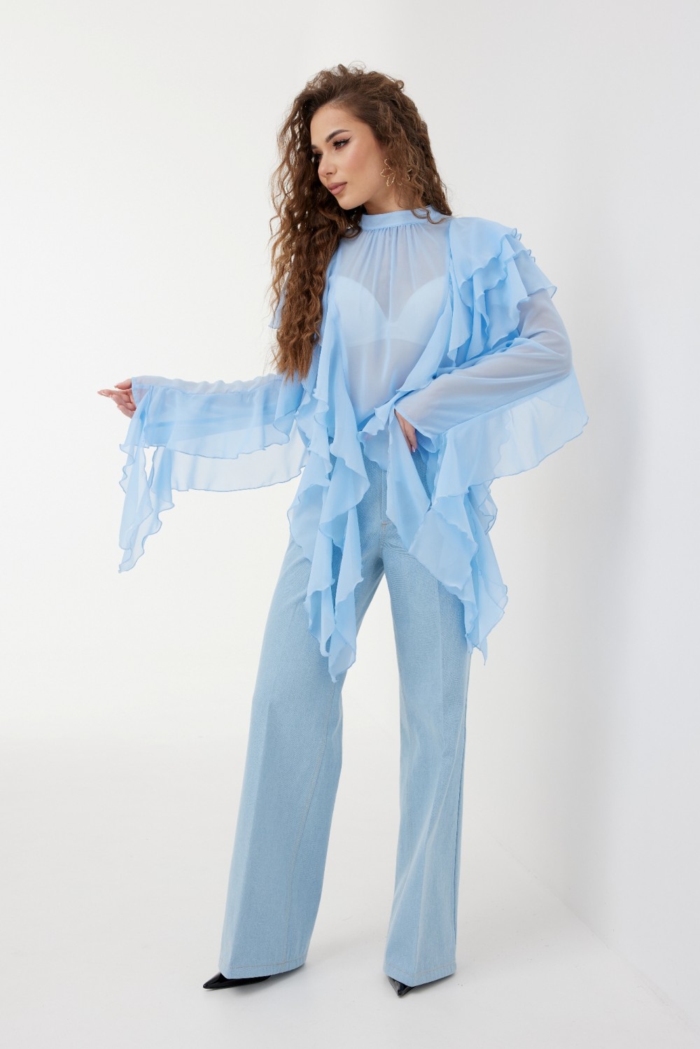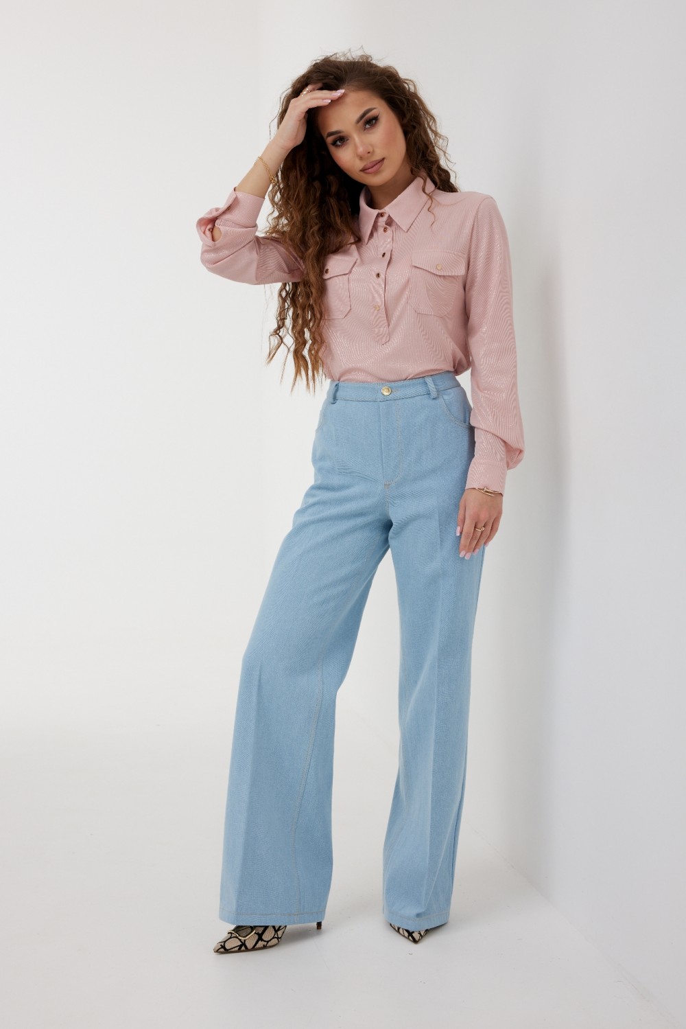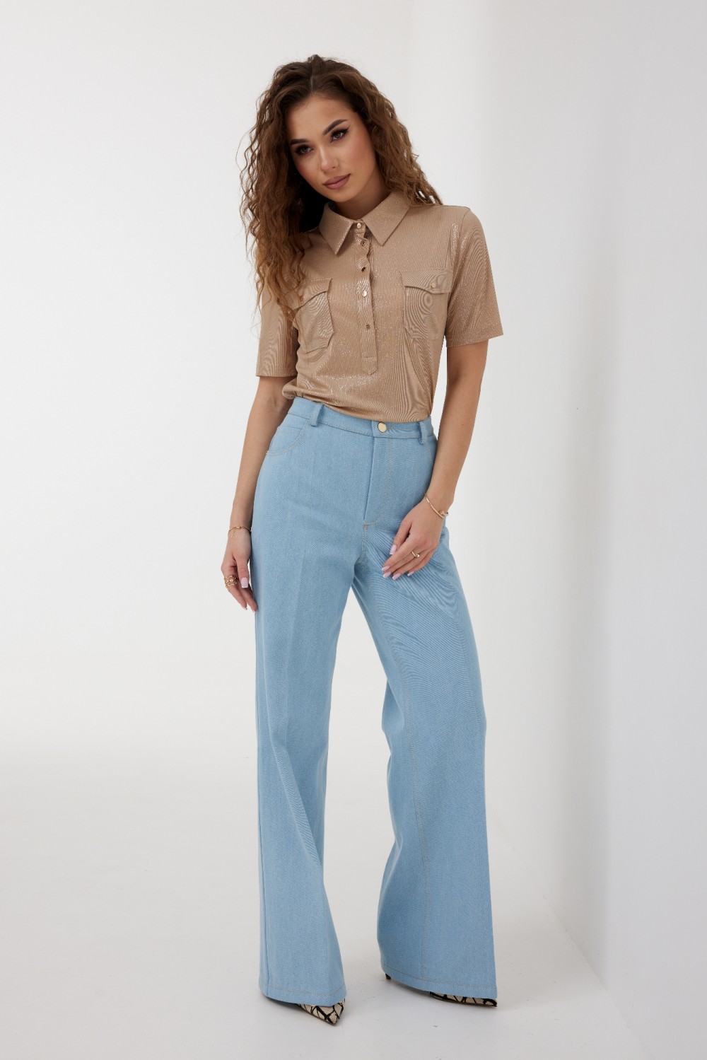 100 % хлопок "Брюки женские из джинсовой ткани, прямого кроя,  расширенные книзу, высокая посадка, пояс