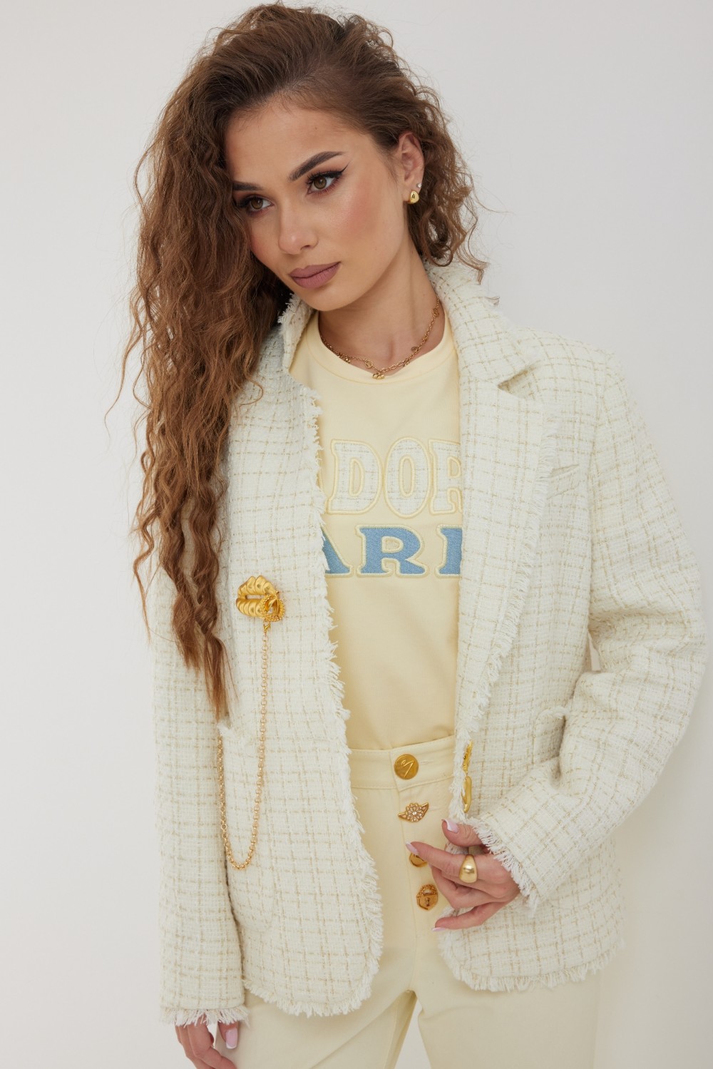 рукава, входу в карман и отлету воротника вставлена бахрома.  Жакет на подкладке с плечевыми накладками."