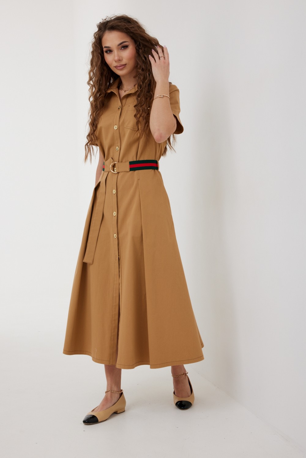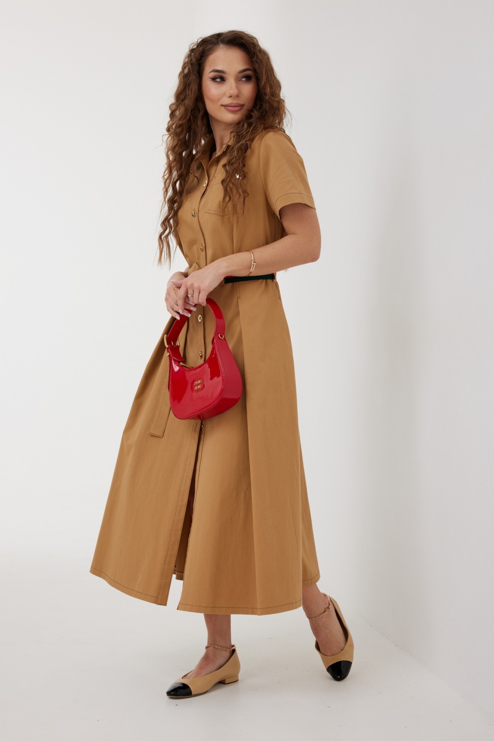 джинсовой ткани полуприлегающего силуэта длины «миди»  расширенное к низу. По талии подрез, нижняя