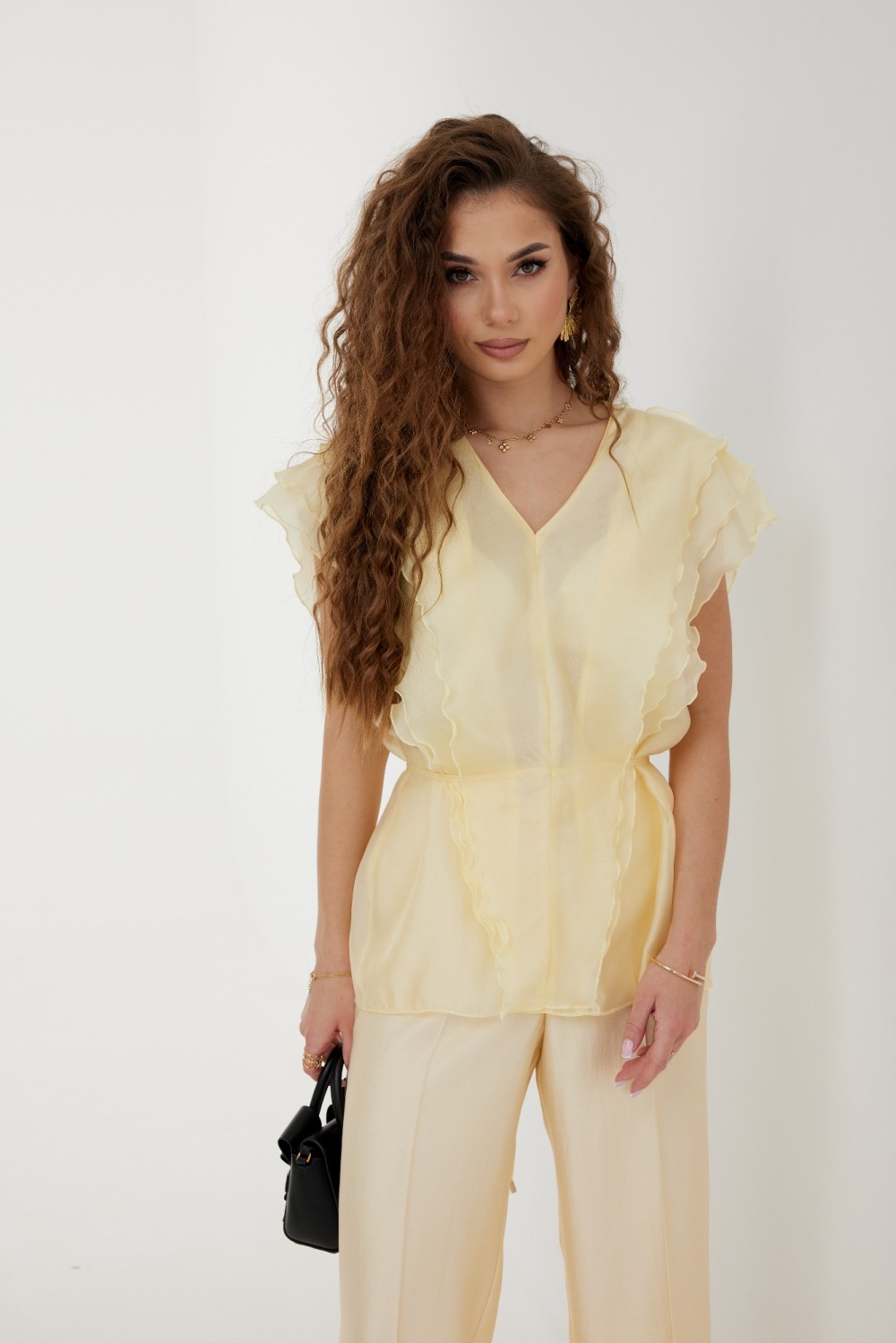силуэта, длиной до уровня бедер, с воланами, образующими  рукава-«крылышки», по переду воланы до низа,