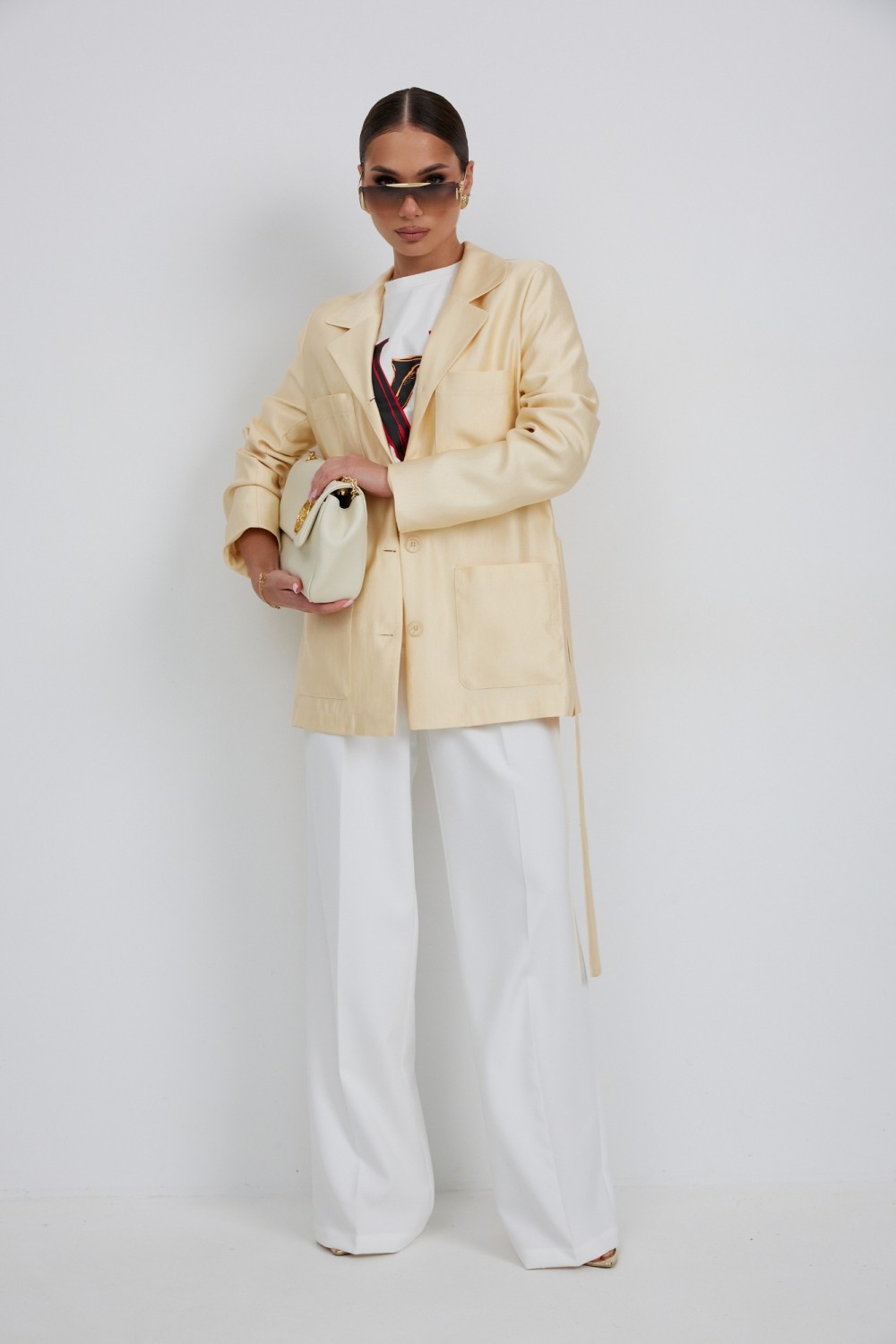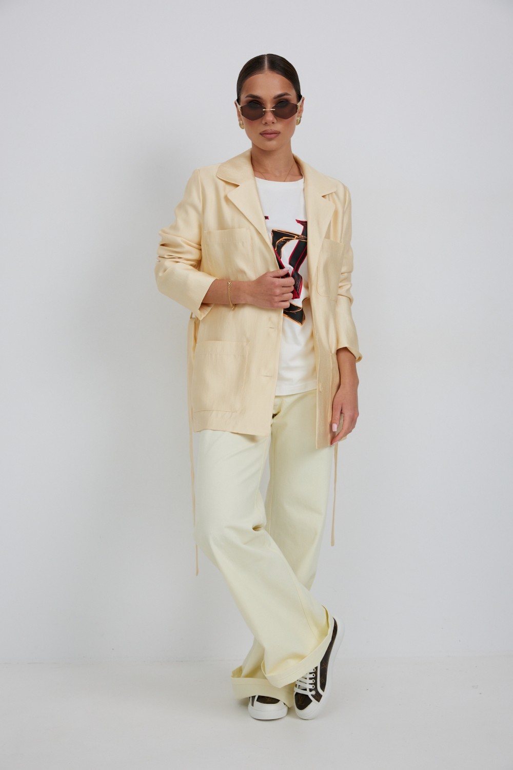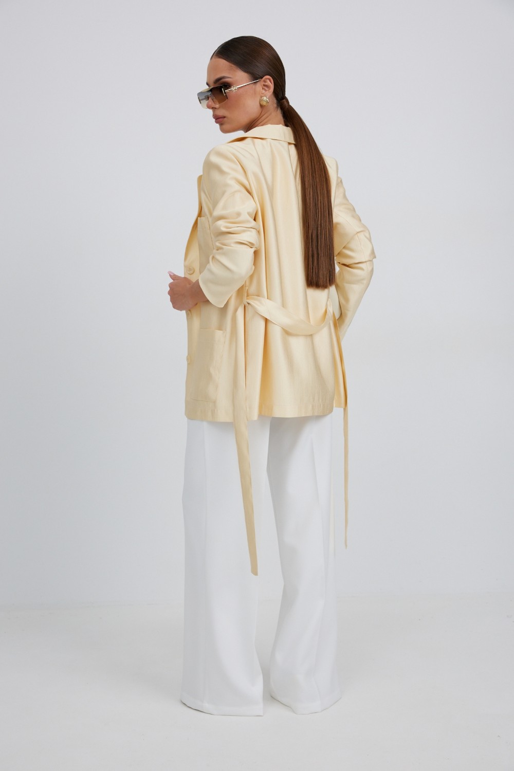 Воротник пиджачный, с закругленными концами воротника и лацканов. Рукав длинный