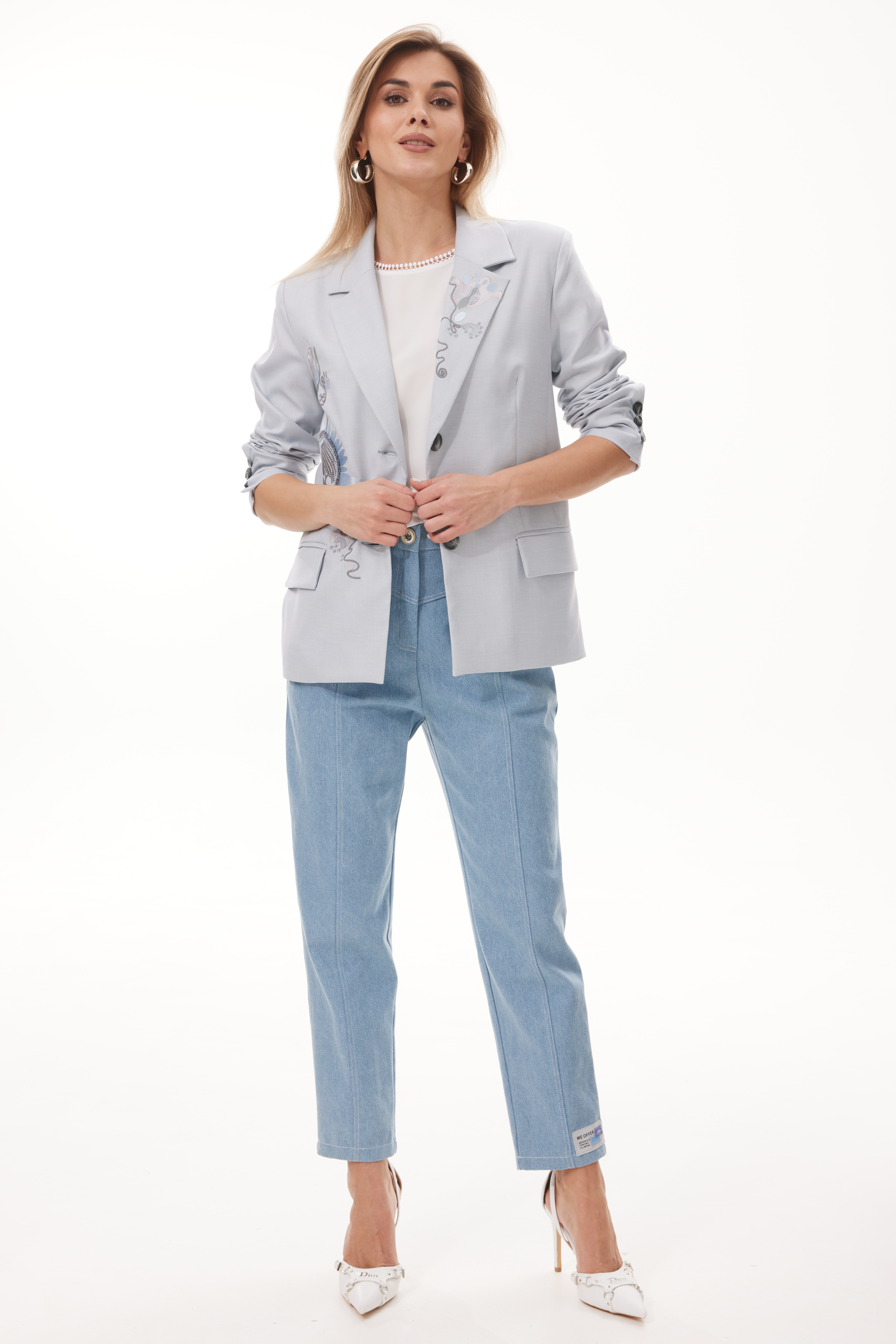 ( Голубой) 42-52 5300 Дизайнерский жакет прямого силуэта .Жакет с втачным рукавом, с центральной застежкой на петли и пуговицы, удобными карманами. Жакет универсальной длины с воротником и лацканами.Перед жакета декорирован дизайнерской вышивкой.