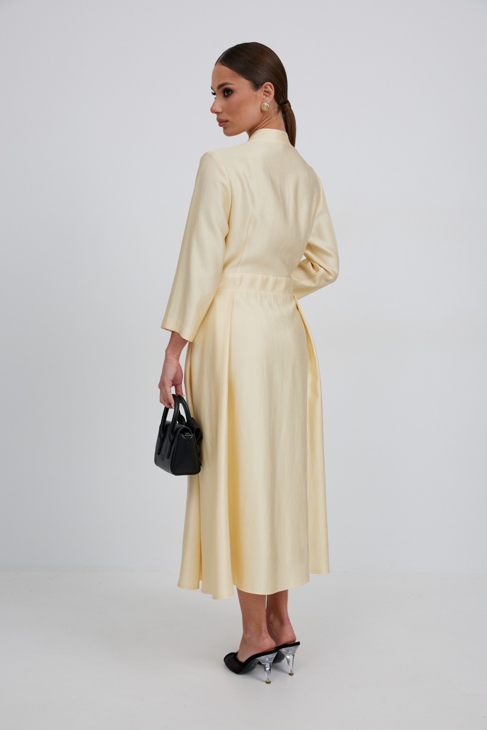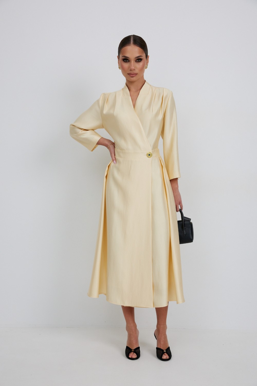 " Платье на запах с отрезной линией талии. Длина миди. Вырез горловины V-образной формы. Застежка по талии на петлю и пуговицу. По переду складки от линии плеча. Юбка со складками. Рукав прямой, длина ¾.