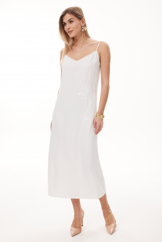 4600 Платье прямого силуэта на бретелях, которые легко регулируются. Длина макси. Перед и спинка изделия декорированы тесьмой . По переду платья вышивка .