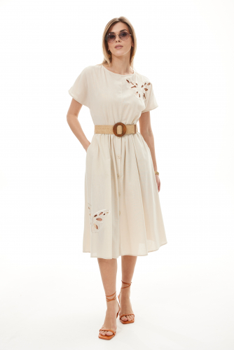 Платье (Бледно-фиолетовый) 42-50 6100 Классическое платье из льняного полотна, отрезное по талии, с боковыми карманами, по нижней части оборка. Нижняя часть платья с центральной застёжкой на петли и пуговицы. Верх и них платья декорированы дизайнерской вышивкой.