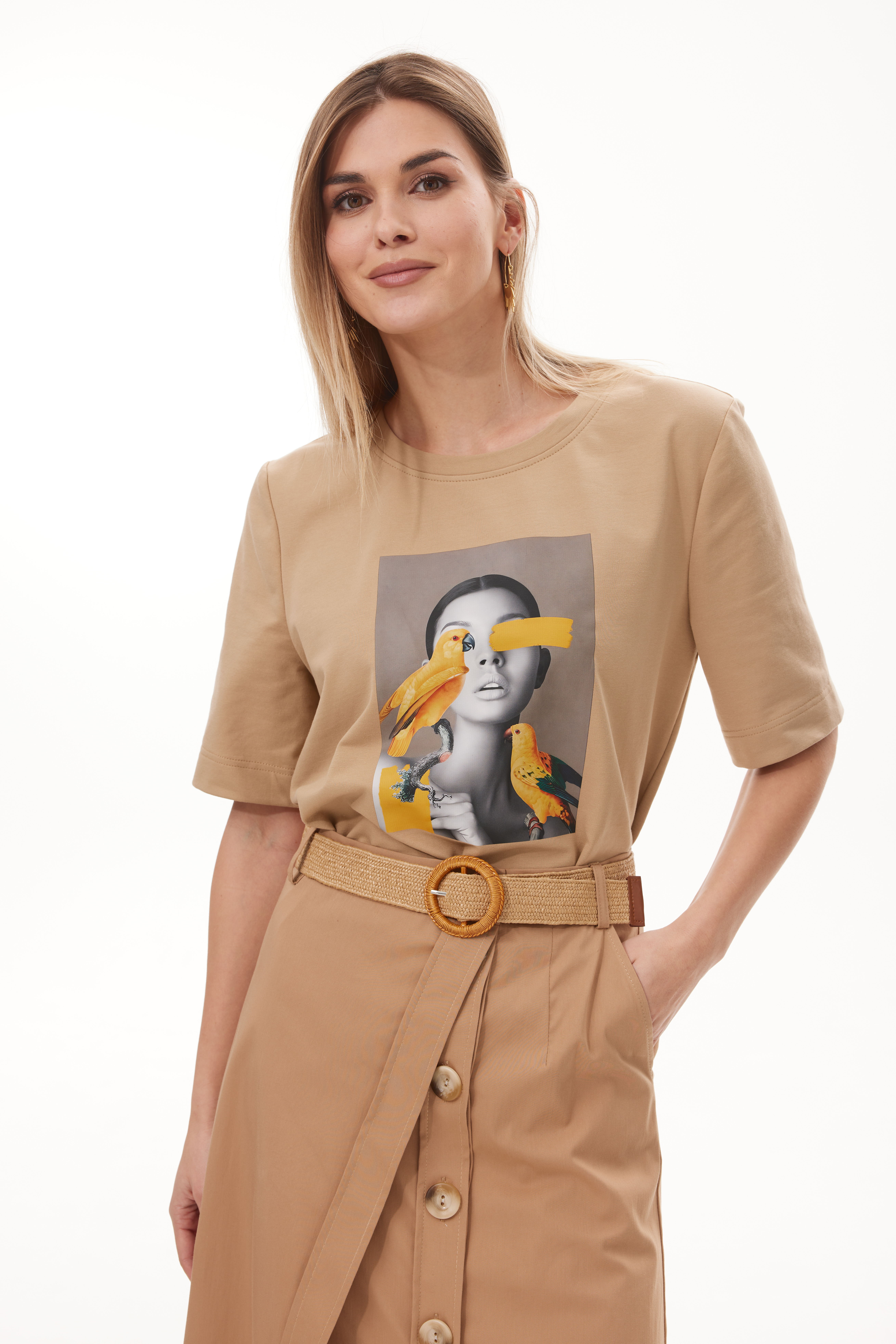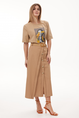 Футболка (Пшеничный) 42-52 3750 Стильная молодёжная футболка в стиле Casual, из хлопкового трикотажного полотна. Модель свободной формы с коротким рукавом. Перед модели декорирован стильной дизайнерской печатью.