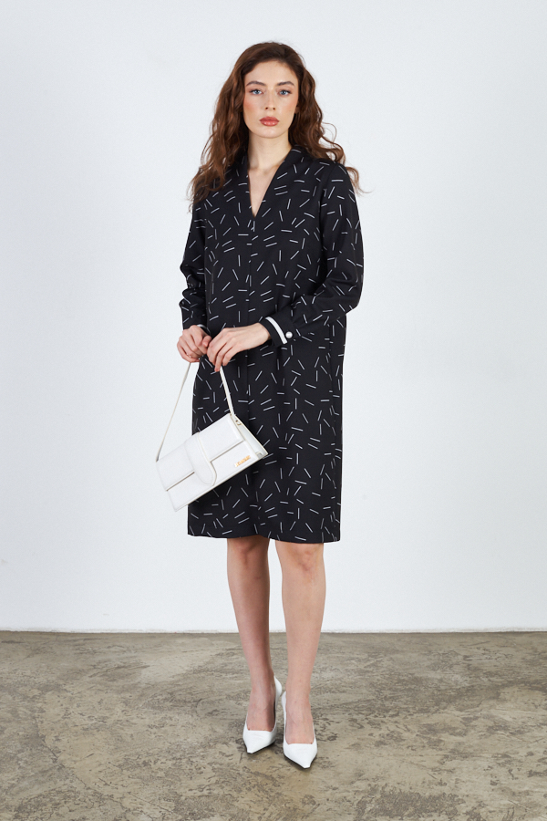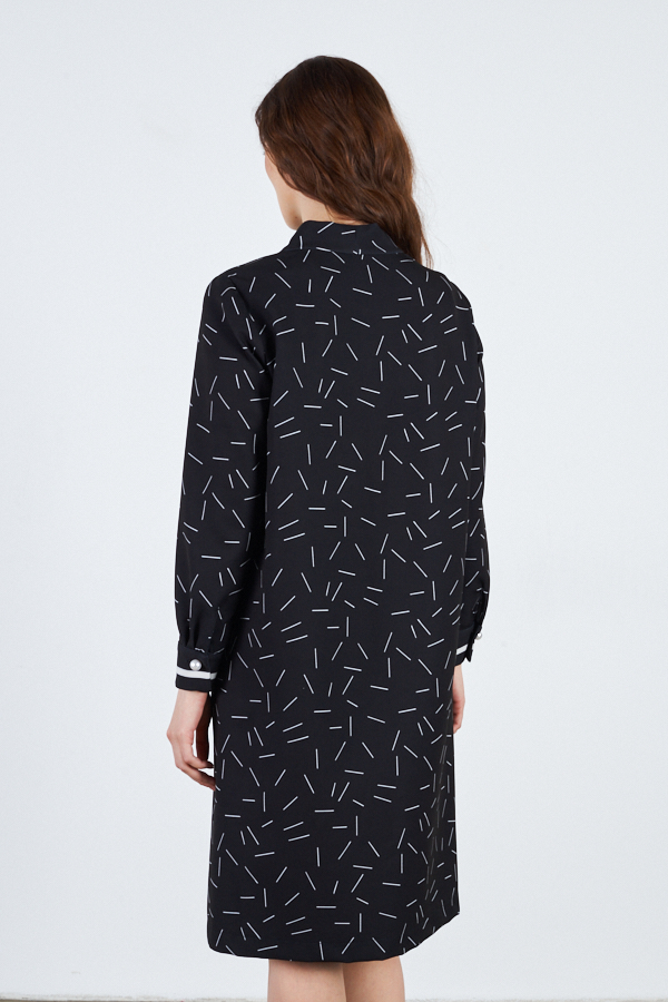 Платье свободного силуэта из плательной ткани. По центру передней части изделия выполнен шов. Цельнокроеная стойка, переходящая в V-образный вырез горловины, визуально делает фигуру стройнее. Втачной длинный рукав. Низ рукава на манжете с застёжкой на пуговицы-жемчужины.