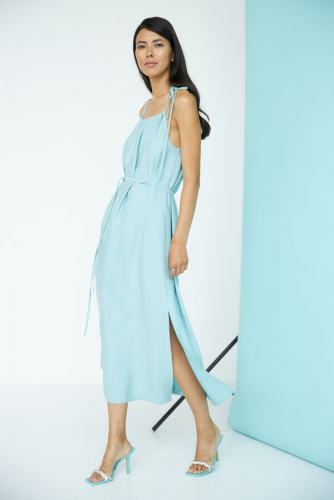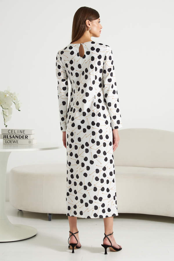 Платье прилегающего силуэта из атласной ткани. Крой платья по косой. Втачной длинный рукав. Круглый вырез горловины, сзади застёжка на петлю-пуговицу.