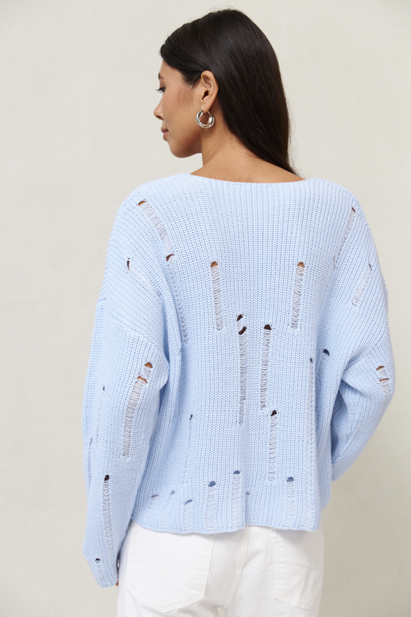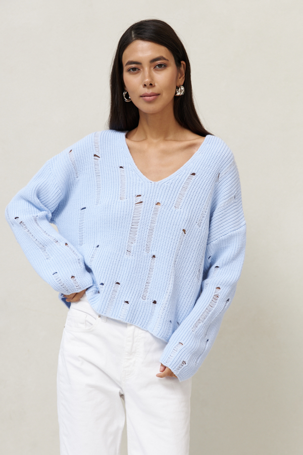 Оригинальный джемпер свободного силуэта с фактурой «жемчужный узор». Изделие со спущенной линией плеча и длинным рукавом. V-образный вырез горловины. Изделие выполнено из мягкой структуриванной пряжи.