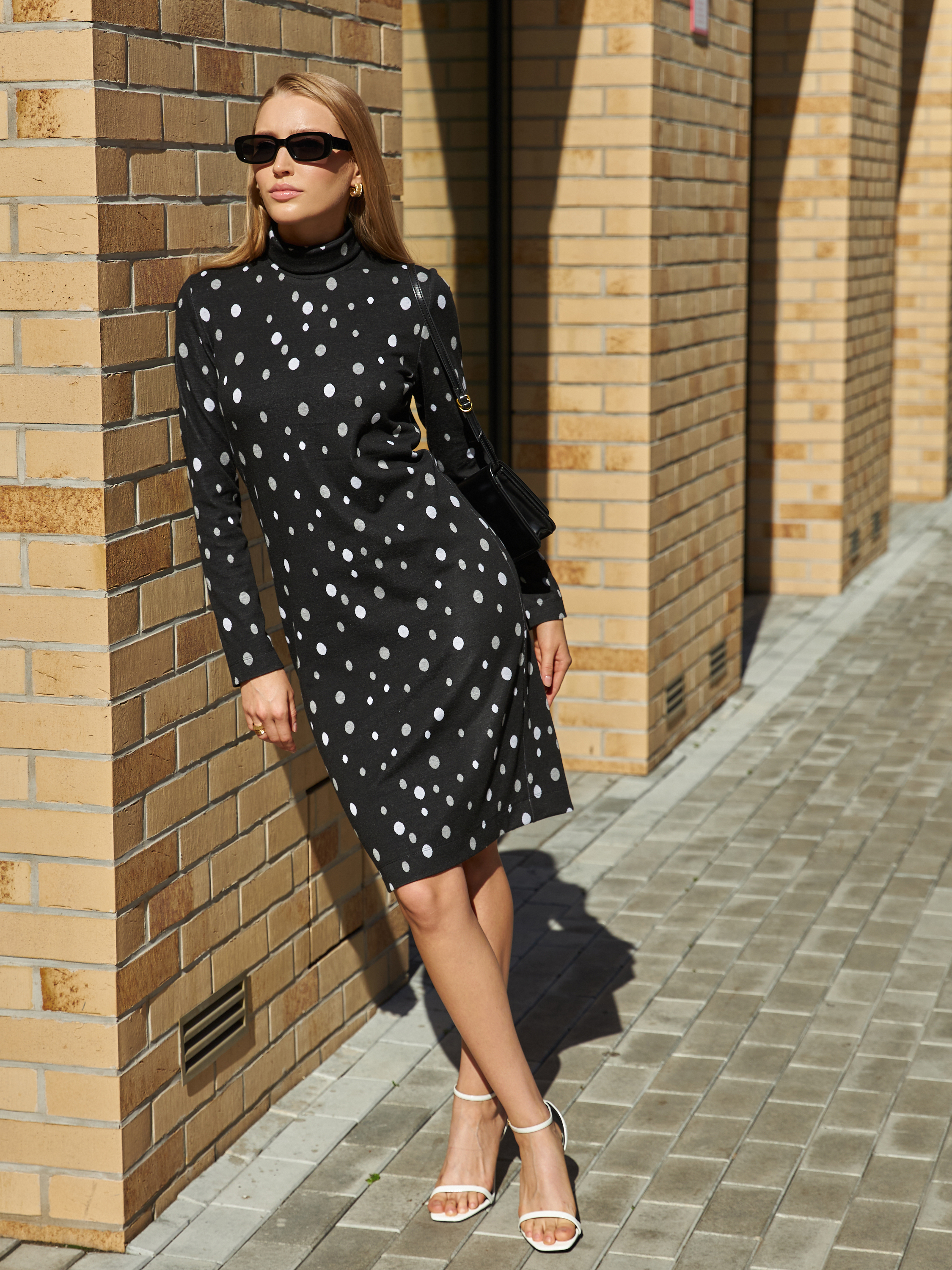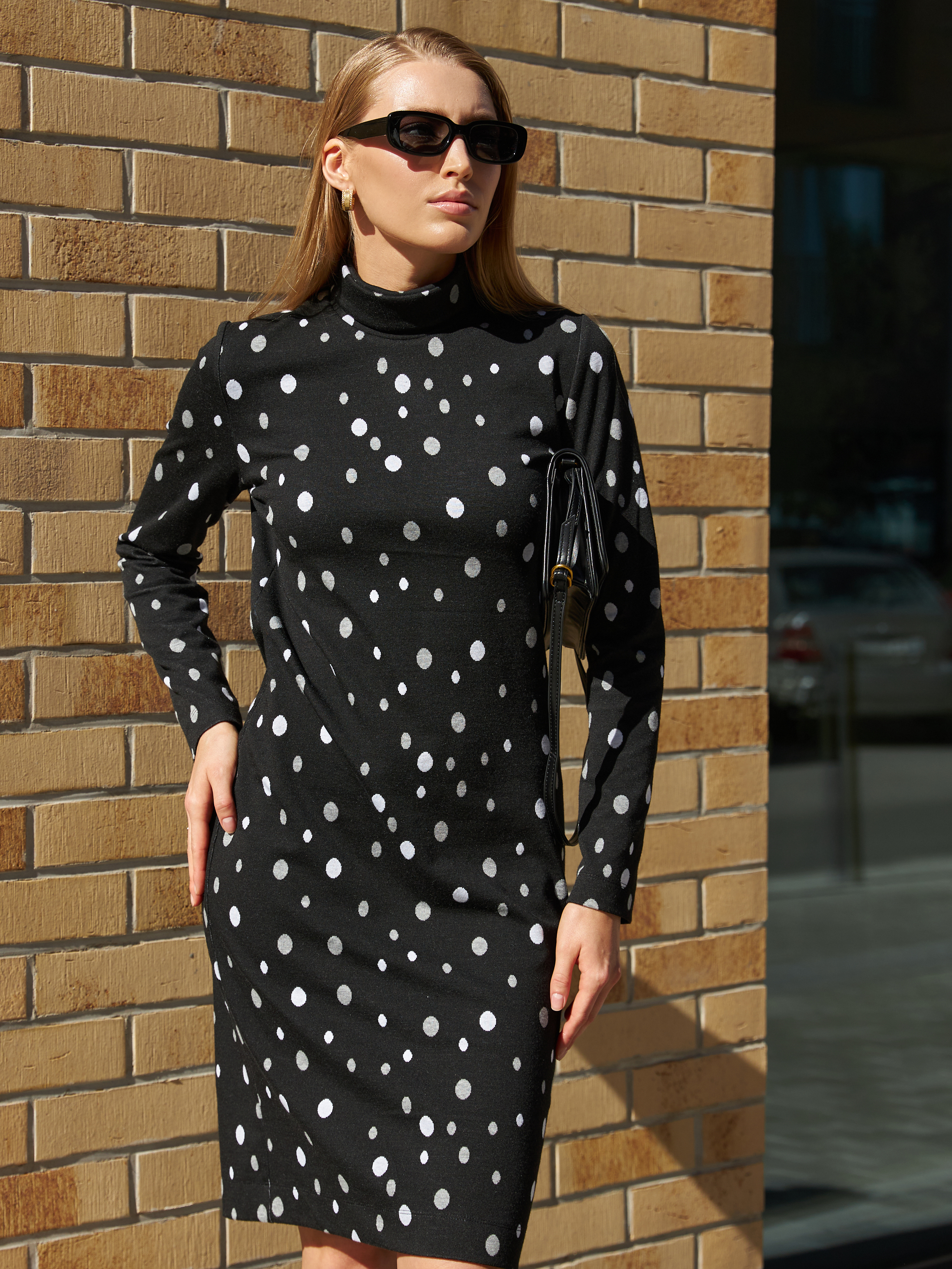 Платье полуприлегающего силуэта из эластичного полотна с жаккардовым узором. Втачной длинный рукав. Воротник-стойка с отворотом.