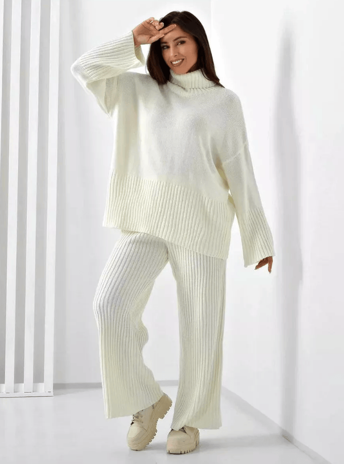 Стильный и модный женский трикотажный костюм Новинка 2025-2026. Воплощение элегантности и комфорта. Изготовленный из высококачественного трикотажного материала, он обладает изысканным дизайном и практичностью одновременно. Костюм включает в себя удлиненный свитер с оригинальным воротником-лапшой и широкими рукавами, а также стильные брюки с завышенной посадкой. Этот набор подчеркнет вашу индивидуальность и создаст неповторимый образ.
