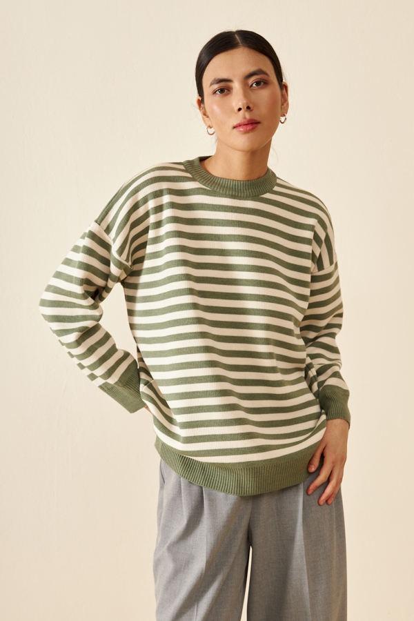 Джемпер очень свободного силуэта со спущенной линией плеча и длинным рукавом. Низ изделия асимметричной длины (спинка удлинена относительно переда) с разрезами по бокам. Круглый вырез горловины, низ изделия и низ рукава оформлены резинкой. Изделие выполнено из мягкой структурированной пряжи.