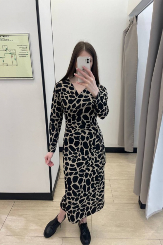 Платье очень свободного силуэта из вискозной ткани с крэш-эффектом. Изделие отрезное по линии талии, с ярусами на юбке. Линия талия завышена. Втачной длинный рукав. Круглый вырез горловины, сзади застёжка на петлю-пуговицу. Низ изделия асимметричной длины (спинка удлинена относительно переда). В таблице размеров представлены параметры человека, а не изделия.
