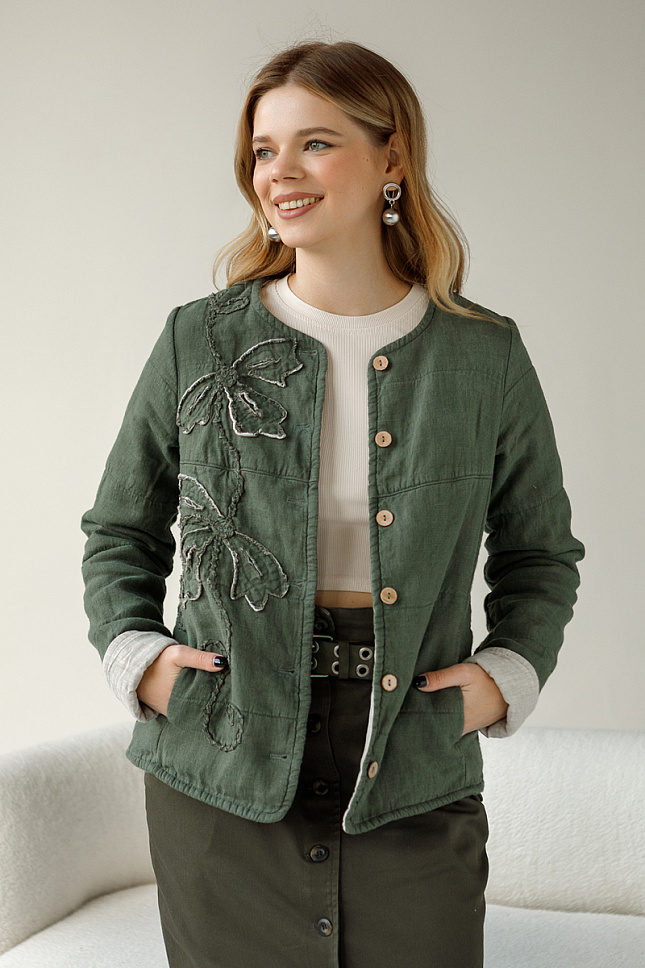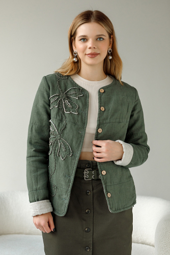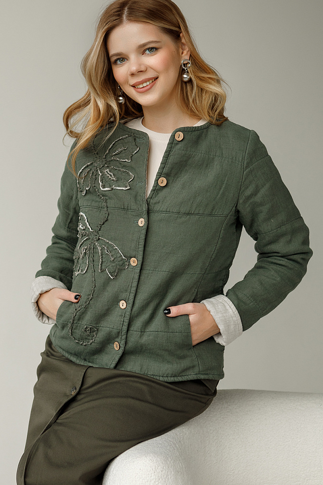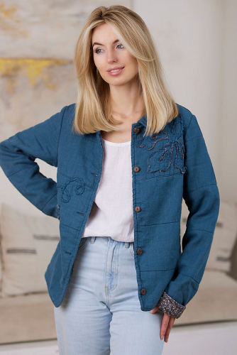 Жакет (я бы назвала его фуфайка) классный, покупаю уже второй (первый-с воротником). На ОГ 102 и ОБ 102 48 размер сел прекрасно на футболку, лонгслив или тонкий шерстяной джемпер. Ношу такой жакет до морозов 12-15гр На мой взгляд жакет подходит практически к любой одежде и любому стилю. К качеству пошива претензий нет