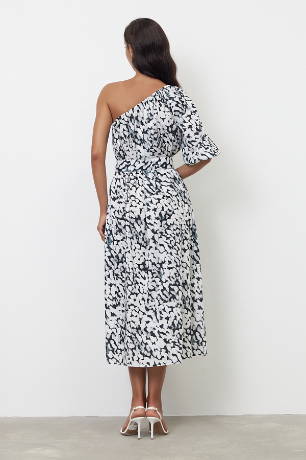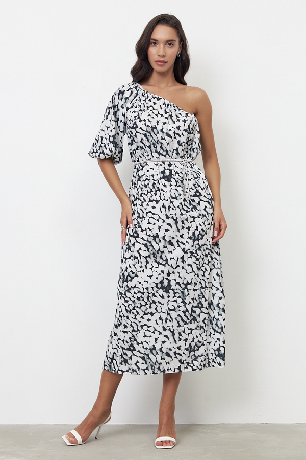 Платье из плательной ткани расклешённое от проймы, в боковых швах карманы. Изделие с одним правым рукавом-реглан. Линия горловины асимметричной формы под левую пройму. Горловина переда и спинки, а также верхний срез рукава собран на резину. В комплекте пояс из основной ткани.