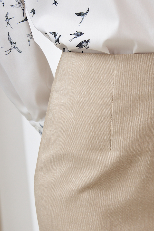 Юбка прилегающего силуэта из меланжевой костюмной ткани. Сзади по среднему шву застёжка-молния, снизу шлица с разрезом. Изделие без пояса, верхний срез обработан обтачкой. На передней и задней половине юбки выполнены талиевые вытачки. Юбка на притачной подкладке.