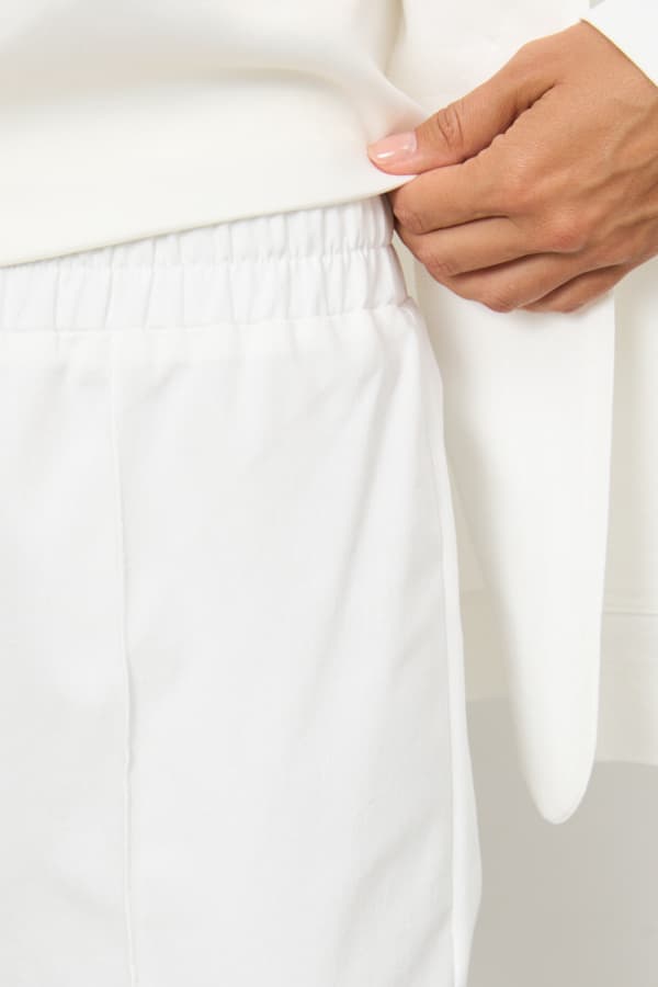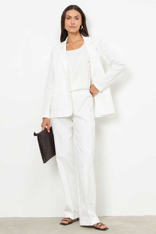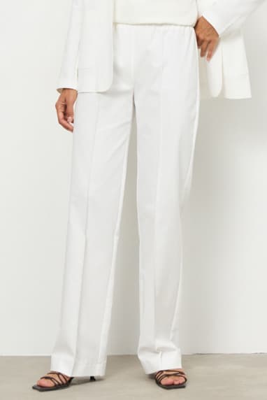 Брюки из хлопковой ткани прямого силуэта. Пояс притачной с эластичной резиной. На передней части брюк застрочены стрелки.