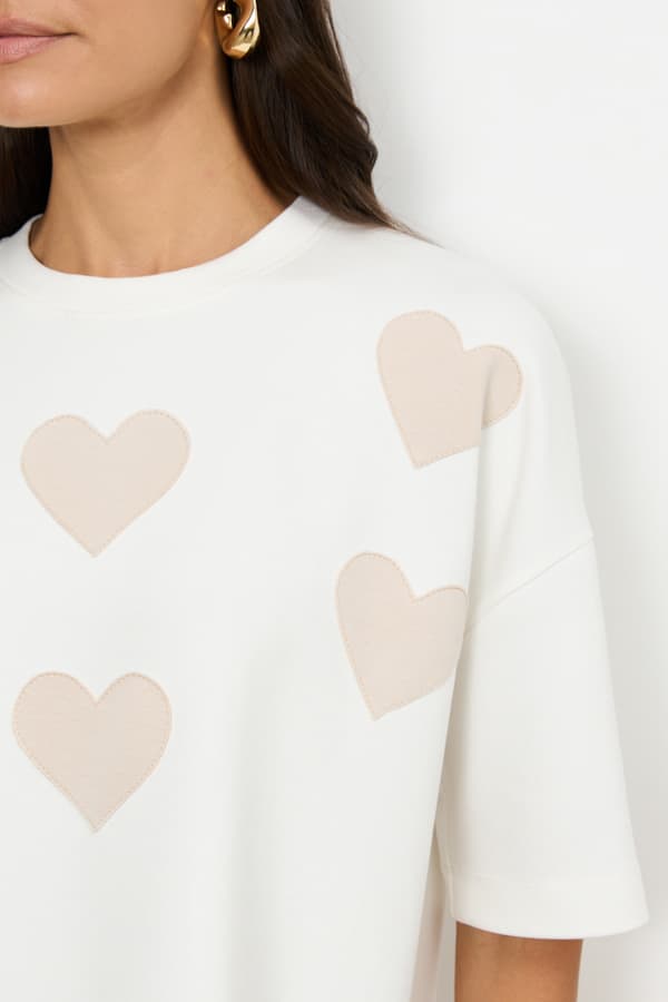 Джемпер из эластичного полотна свободного силуэта. Изделие со спущенной линией плеча и коротким рукавом. Вырез горловины оформлен бейкой из основной ткани. На передней части изделия выполнена аппликация. В таблице размеров представлены параметры человека, а не изделия.