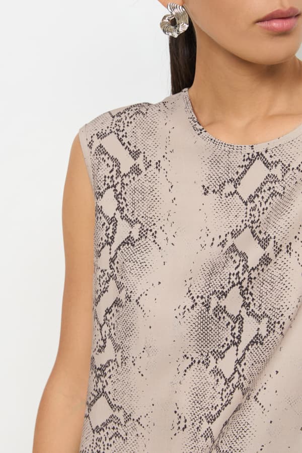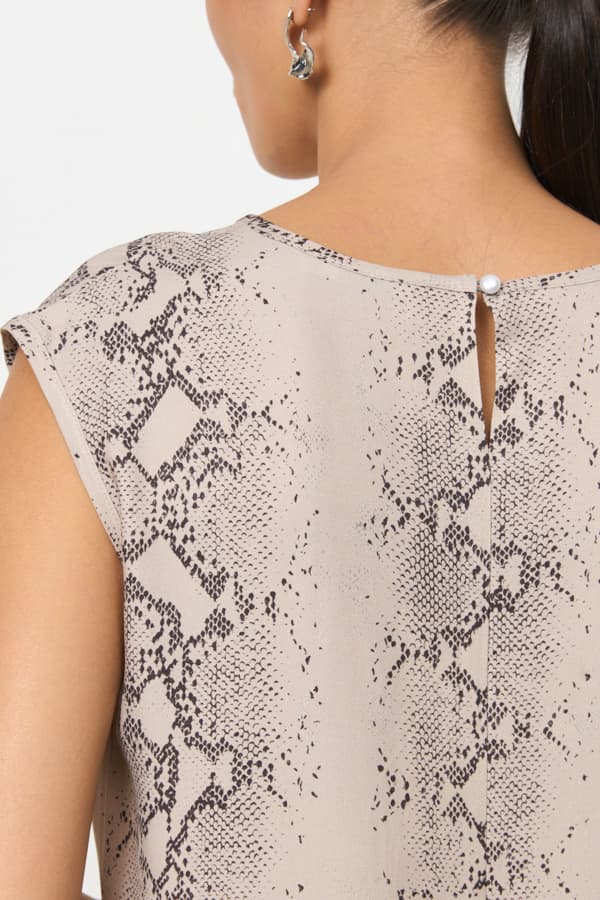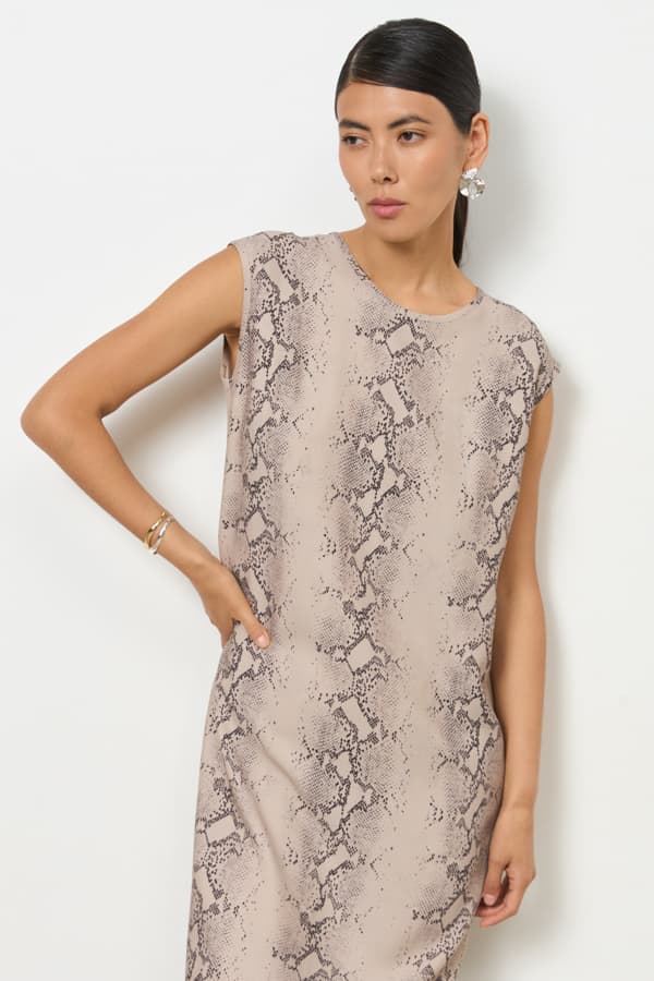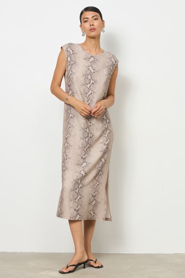Платье из вискозной ткани. Полуприлегающий силуэт, с разрезом в боковом шве. По среднему шву спинки застёжка на петлю-пуговицу. Круглый вырез горловины и линия проймы окантованы косыми бейками из основной ткани.