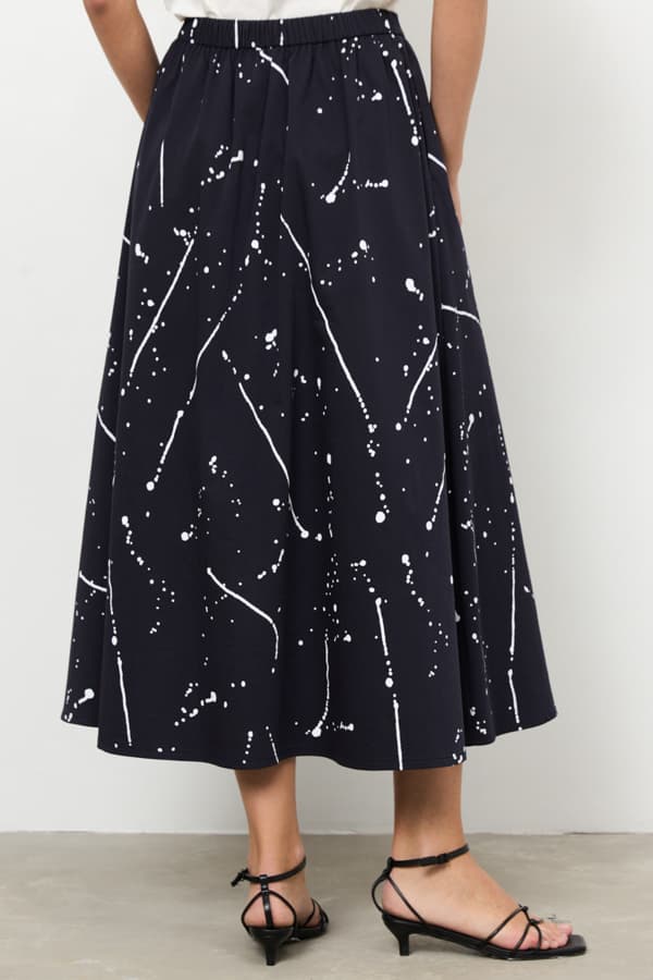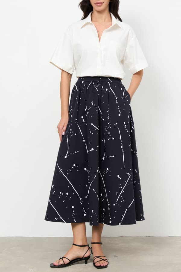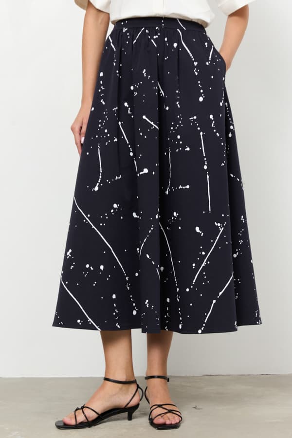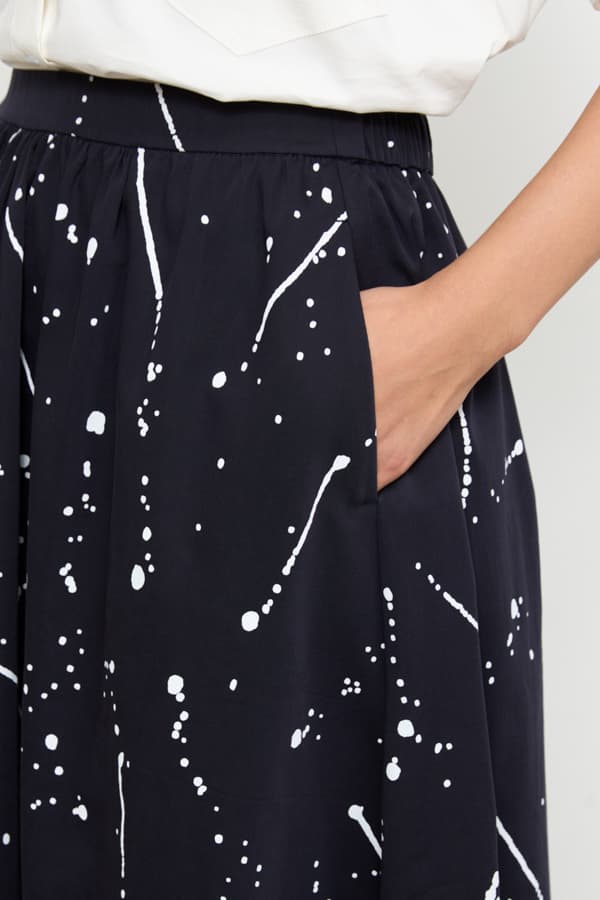 Юбка из хлопковой ткани свободного силуэта с карманами в боковых швах. Пояс притачной. На передней части изделия — сборка по линии талии, на задней — пояс с эластичной резинкой.