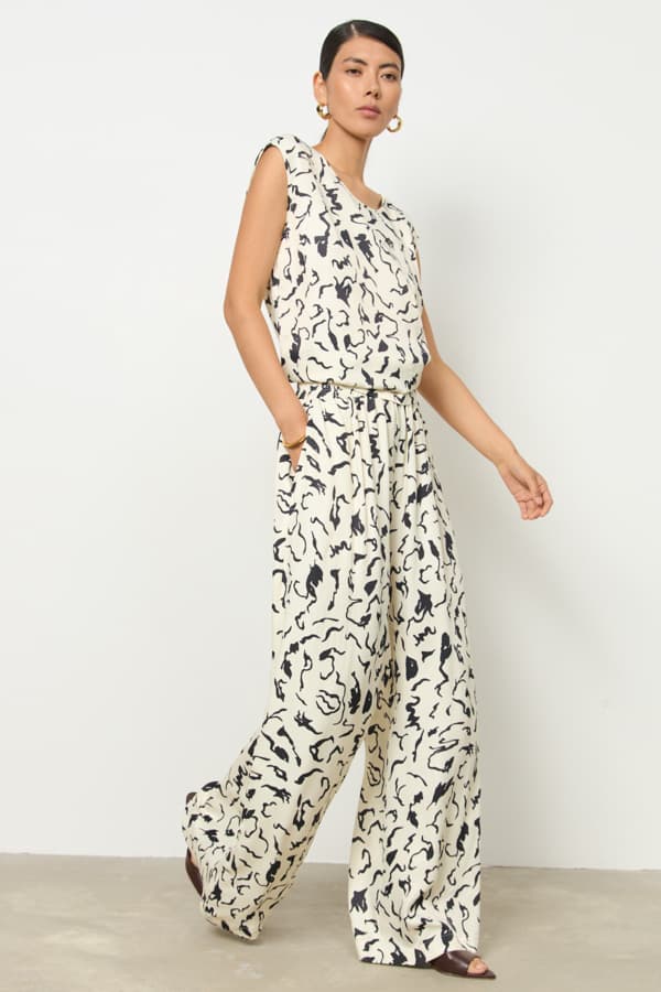 Брюки из вискозной ткани с сатиновым блеском. Прямой свободный силуэт. Пояс притачной с эластичной резиной, в боковых швах карманы.