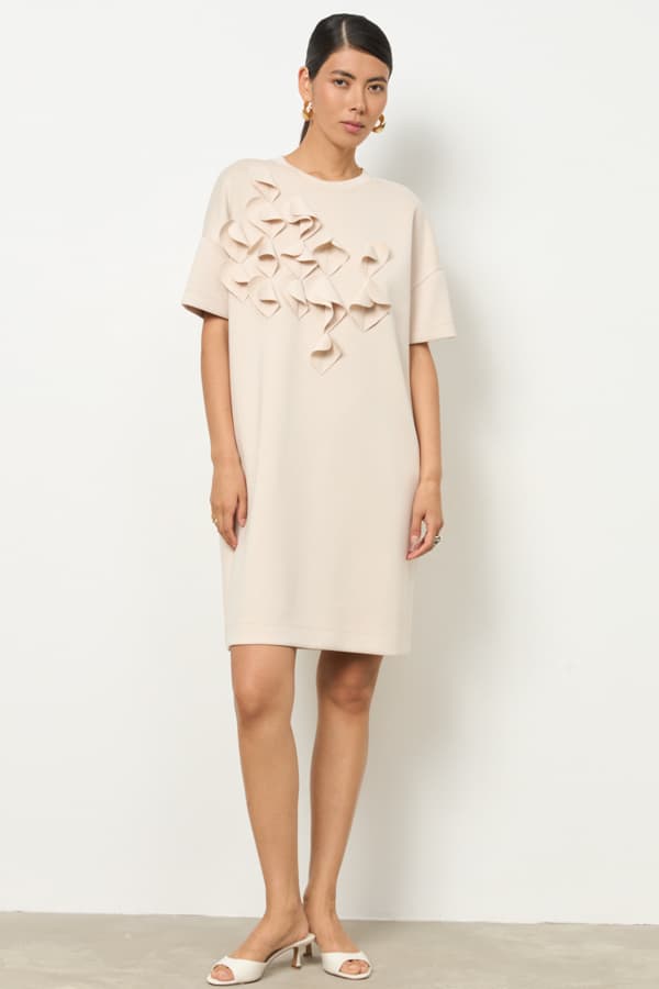 Платье из эластичного полотна. Свободный силуэт со спущенной линией плеча и коротким рукавом. Вырез горловины оформлен бейкой из основной ткани. На передней части изделия выполнена аппликация. В таблице размеров представлены параметры человека, а не изделия.