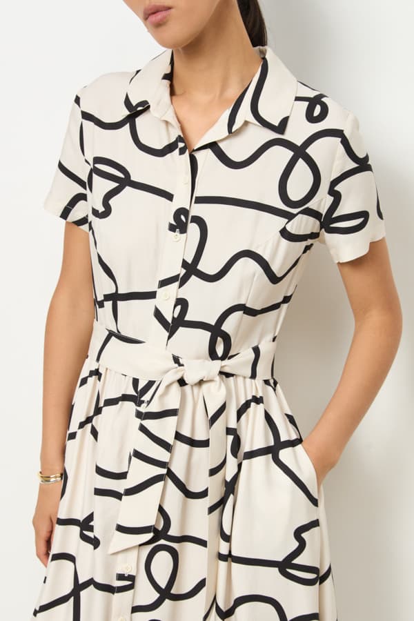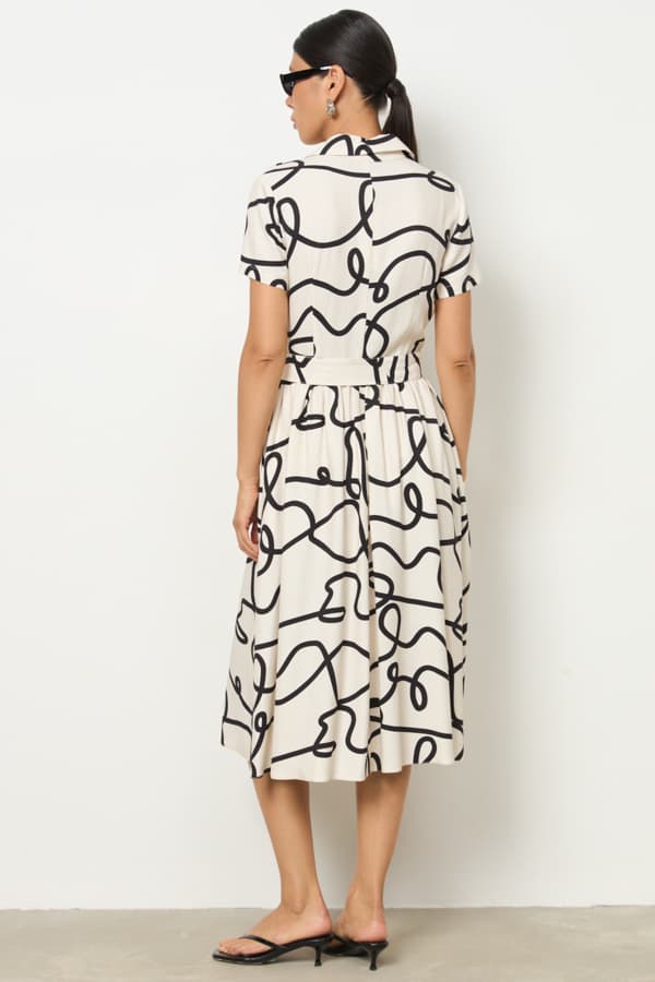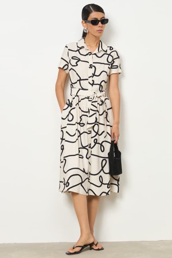 Платье из вискозной ткани приталенного силуэта с застёжкой на пуговицы. Изделие отрезное по линии талии со сборкой. В боковых швах карманы. Втачной короткий рукав. Вырез горловины обработан отложным воротником на стойке. В комплекте пояс из основной ткани.
