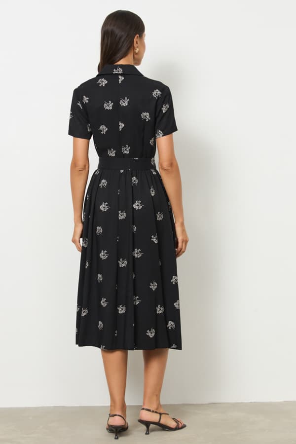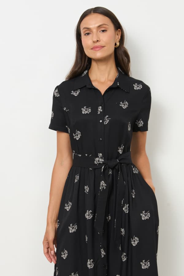 Платье из вискозной ткани приталенного силуэта с застёжкой на пуговицы. Изделие отрезное по линии талии со сборкой. В боковых швах карманы. Втачной короткий рукав. Вырез горловины обработан отложным воротником на стойке. В комплекте пояс из основной ткани.