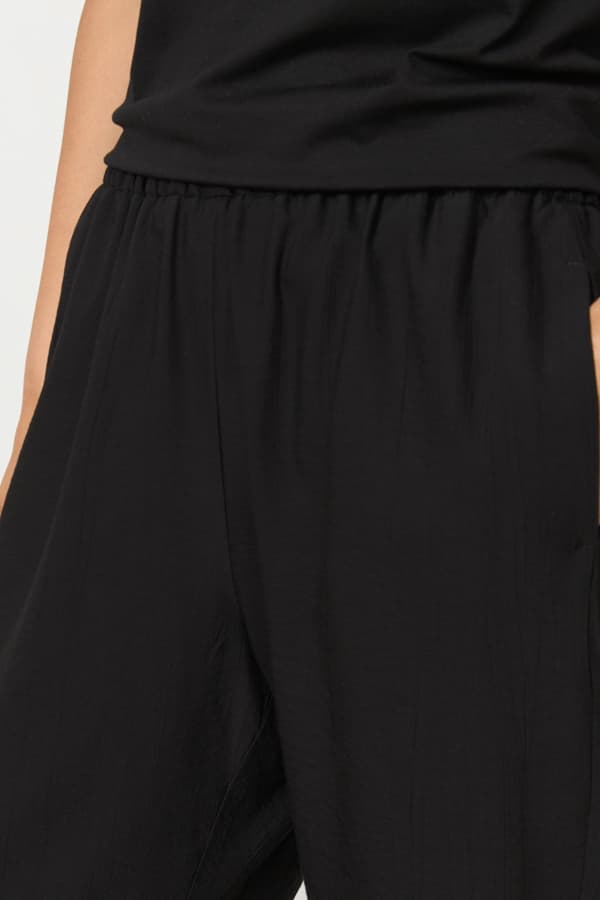 Брюки из вискозной ткани с крэш-эффектом прямого силуэта. Пояс с эластичной резинкой. В боковых швах - карманы.