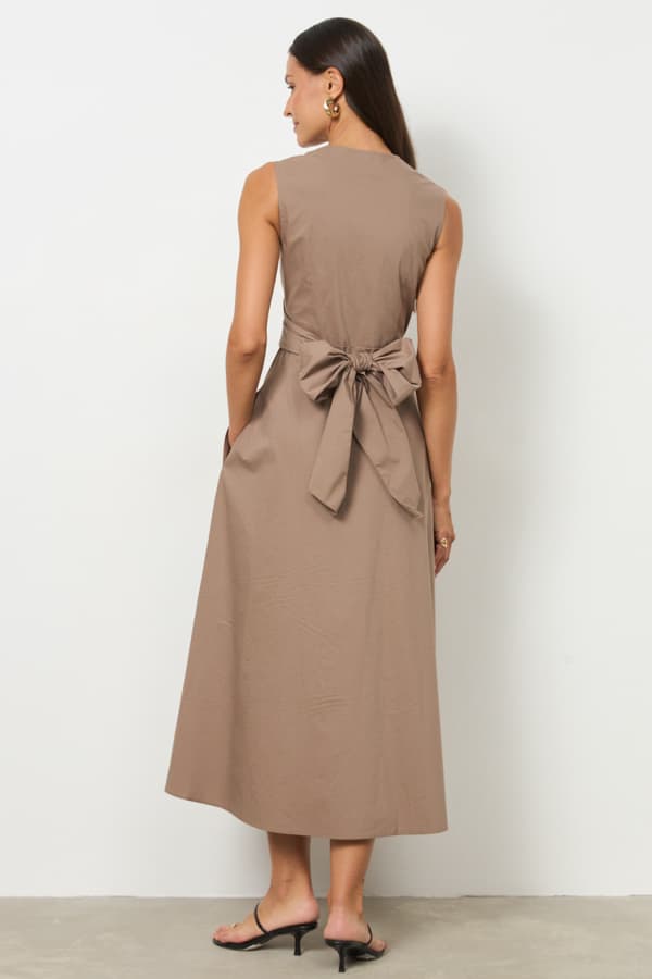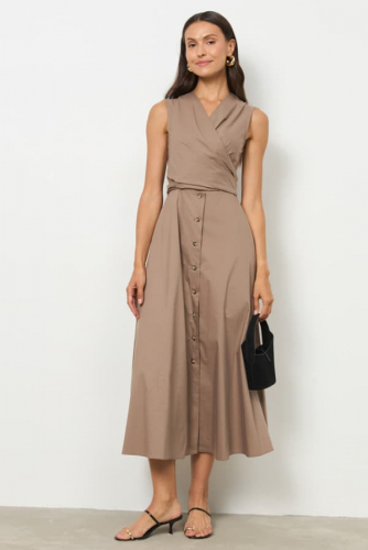 Платье из хлопковой ткани отрезное по линии талии. Изделие прилегающего силуэта в области груди и свободного кроя в области бёдер, с карманами в боковых швах. Линия талии завышена. На полочке нагрудная вытачка переведена в широкий цельнокроеный пояс, завязывающийся сзади. На спинке — талиевые вытачки. Глубокий V-образный вырез горловины. Застёжка на пуговицы в нижней части платья.