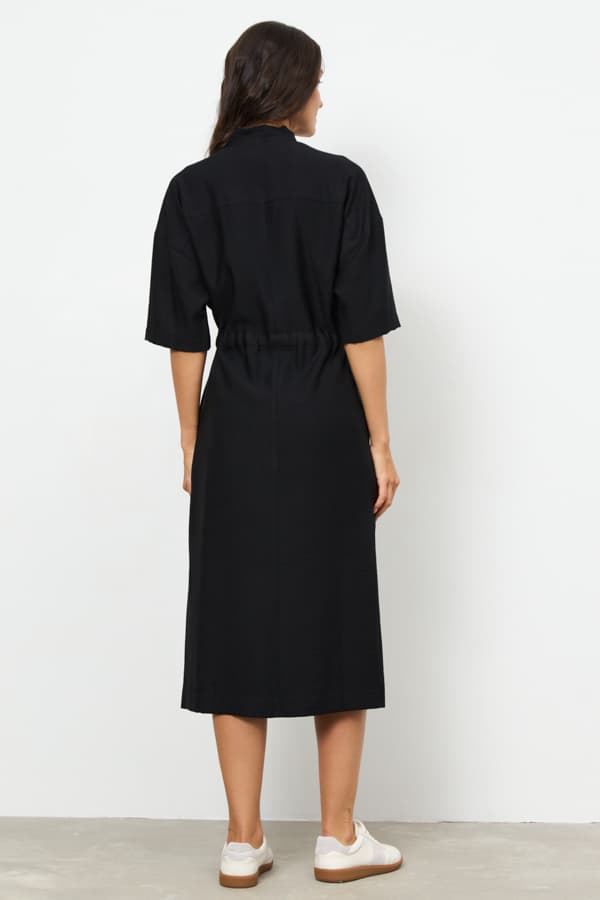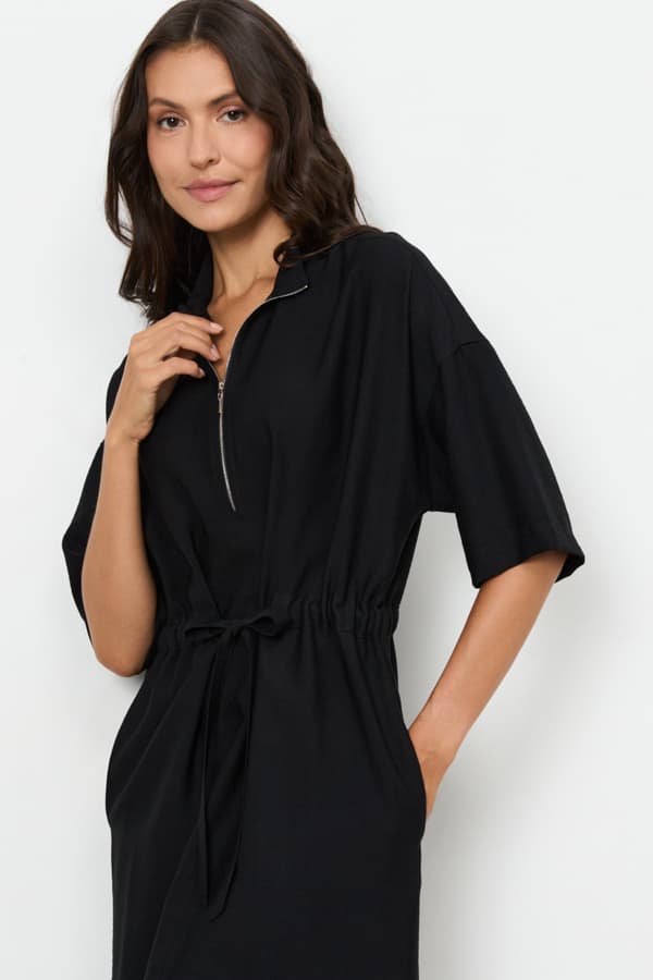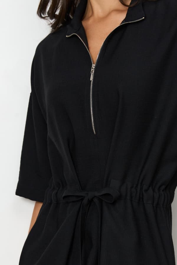 Платье из ткани с крэш-эффектом свободного силуэта с разрезами в боковых швах. Изделие со спущенной линией плеча и коротким рукавом, в боковых швах – карманы. Воротник-стойка. На передней части изделия выполнена застежка-молния. По линии талии изделие затягивается на кулиску.