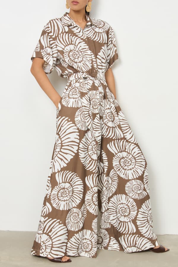 Стильный комбинезон из комфортной вискозной ткани. Изделие отрезное по линии талии, с резинкой. Свободный силуэт с застёжкой на пуговицы, в боковых швах карманы. Втачной короткий рукав с отворотом. На задней части изделия выполнена кокетка с небольшой складкой. Вырез горловины обработан отложным воротником на стойке. В комплекте пояс из основной ткани.