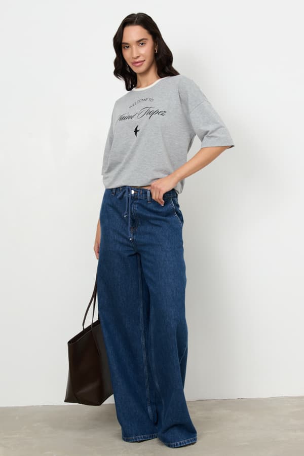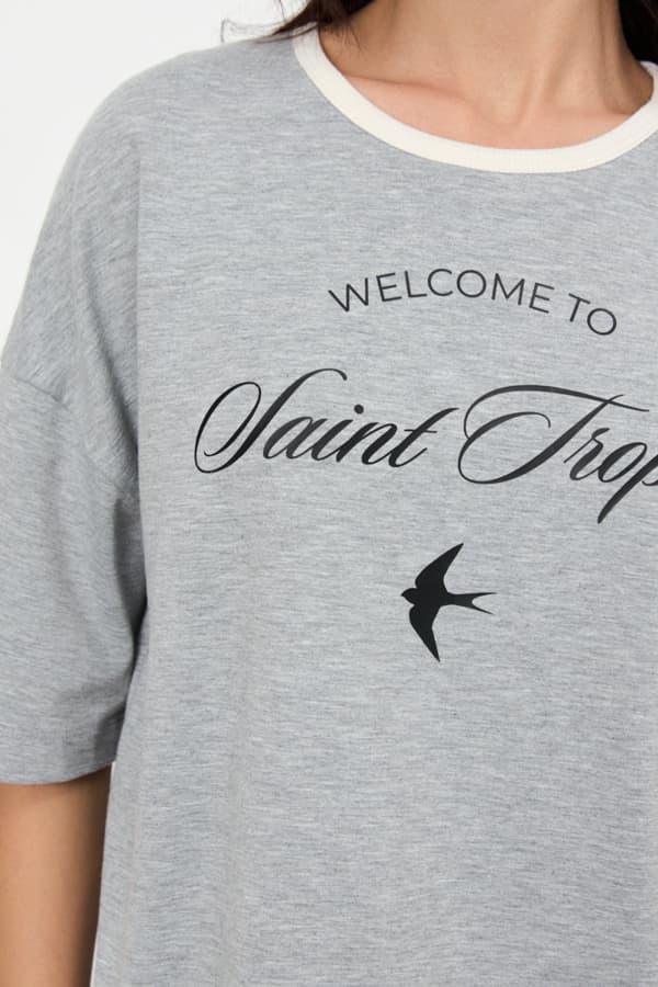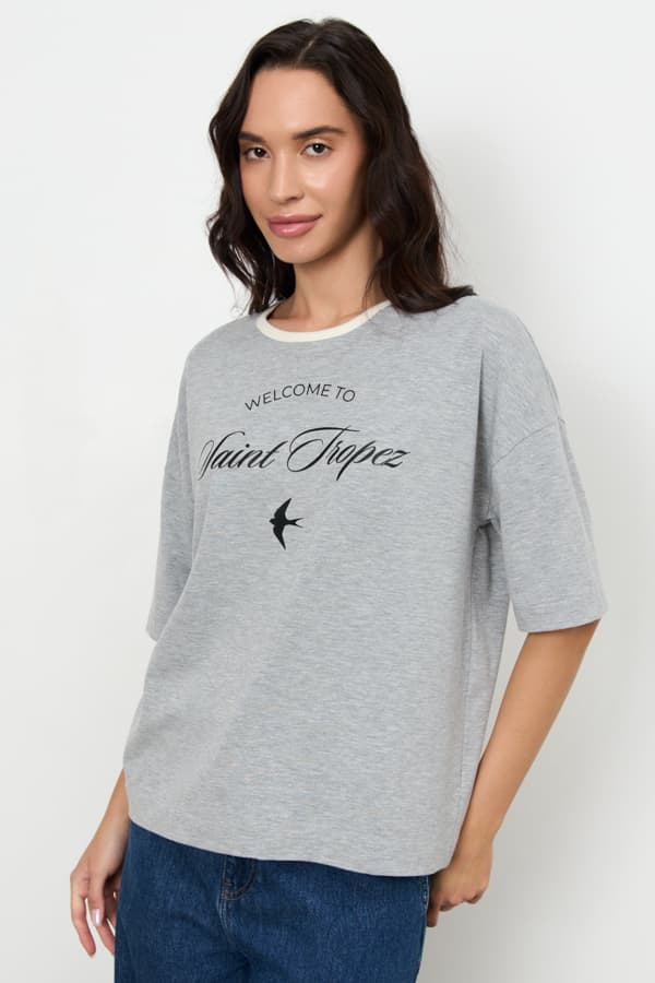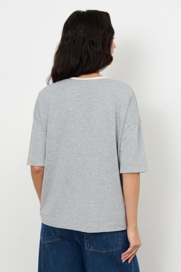 Джемпер из эластичного полотна. Свободный силуэт со спущенной линией плеча и коротким рукавом. Вырез горловины окантован эластичной бейкой. В таблице размеров представлены параметры человека, а не изделия.