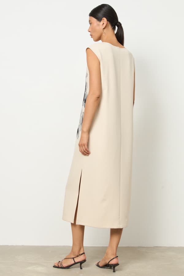 Платье из плательной ткани полуприлегающего силуэта с разрезом в боковом шве. Круглый вырез горловины.