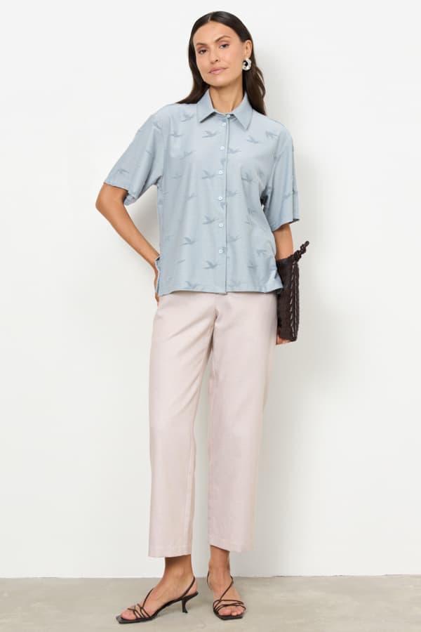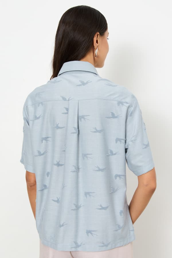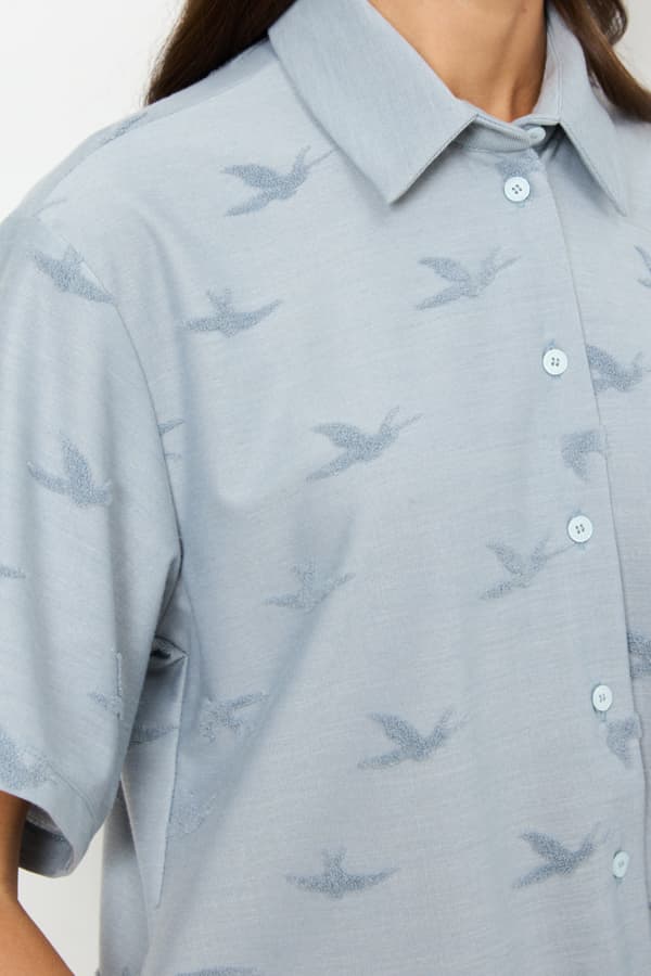 Рубашка из эластичного полотна с фактурным рисунком. Свободный силуэт с разрезами в боковых швах и застёжкой на пуговицы. Вырез горловины обработан отложным воротником на стойке. Короткий рубашечный рукав. На задней части изделия выполнена кокетка с небольшой складкой.