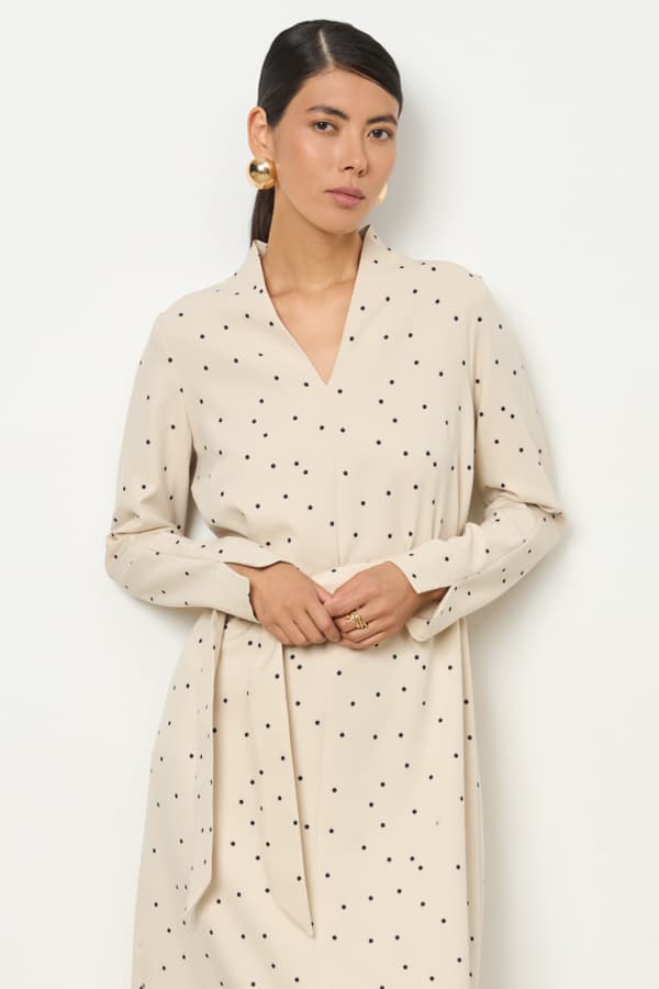 Платье из плательной ткани свободного силуэта. По центру передней части изделия выполнен шов. Цельнокроеная стойка, переходящая в V-образный вырез горловины, визуально делает фигуру стройнее. Втачной длинный рукав с центральным швом и декоративным разрезом по низу. В комплекте - пояс из основной ткани.