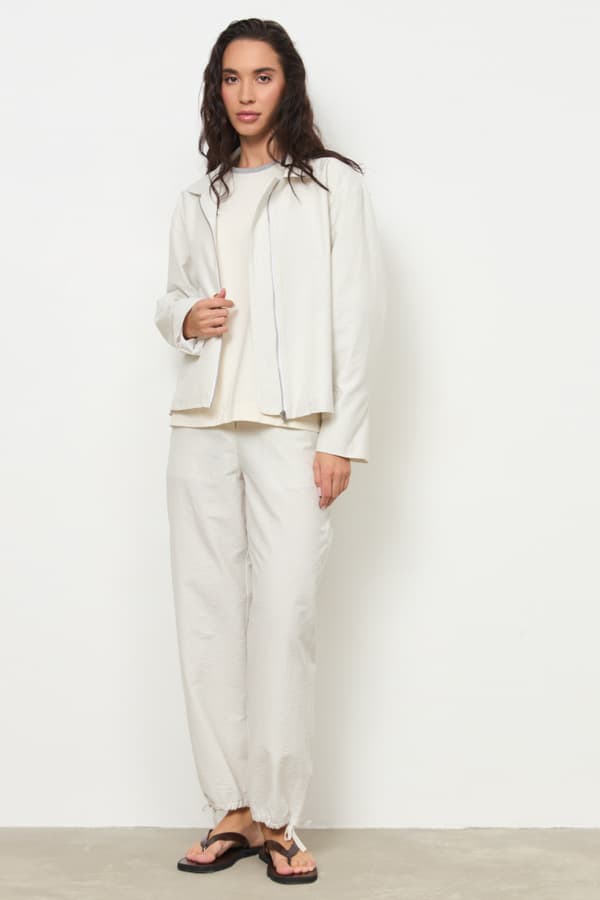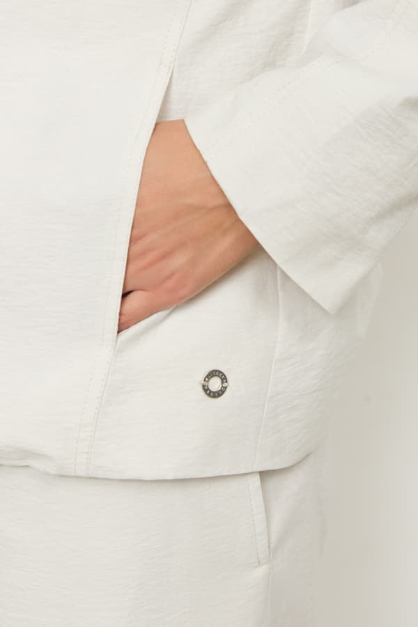 Жакет-бомбер выполнен из фактурного органического хлопка. Свободный силуэт с застёжкой-молнией и карманами в рельефах. Рукав втачной, со спущенным плечом. Нижняя часть рукава - с застроченными складками. Линия горловины оформлена отложным воротником. На задней части изделия выполнена кокетка, по низу изделия - небольшие защипы. Жакет на подкладке.