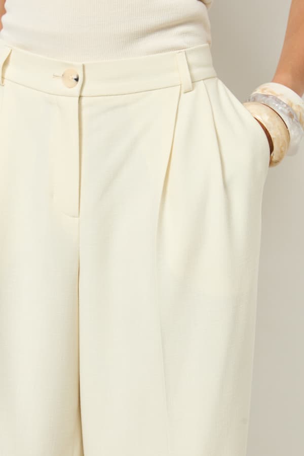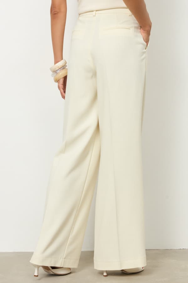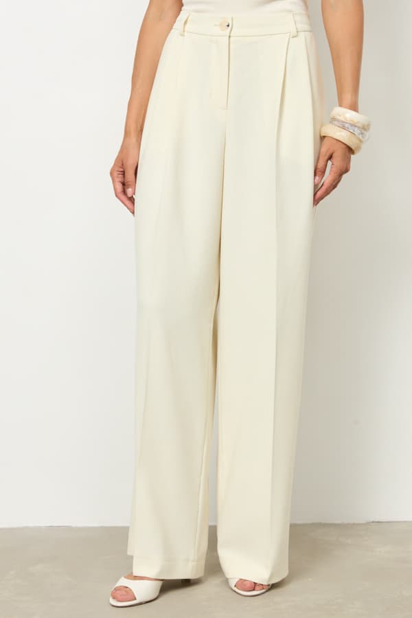 Брюки из вискозной ткани свободного силуэта. На передней половинке выполнены карманы с подкройным бочком, по линии талии заложены складки. На задней половинке - талиевые вытачки и имитация карманов в рамку. Притачной пояс со шлёвками. Застёжка на молнию-гульфик и пуговицу. Такой крой выгодно подчеркнёт длину ваших ног.