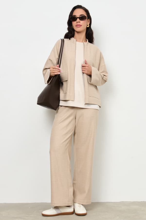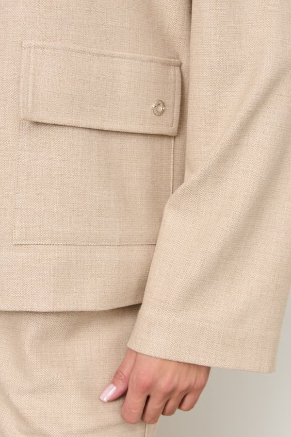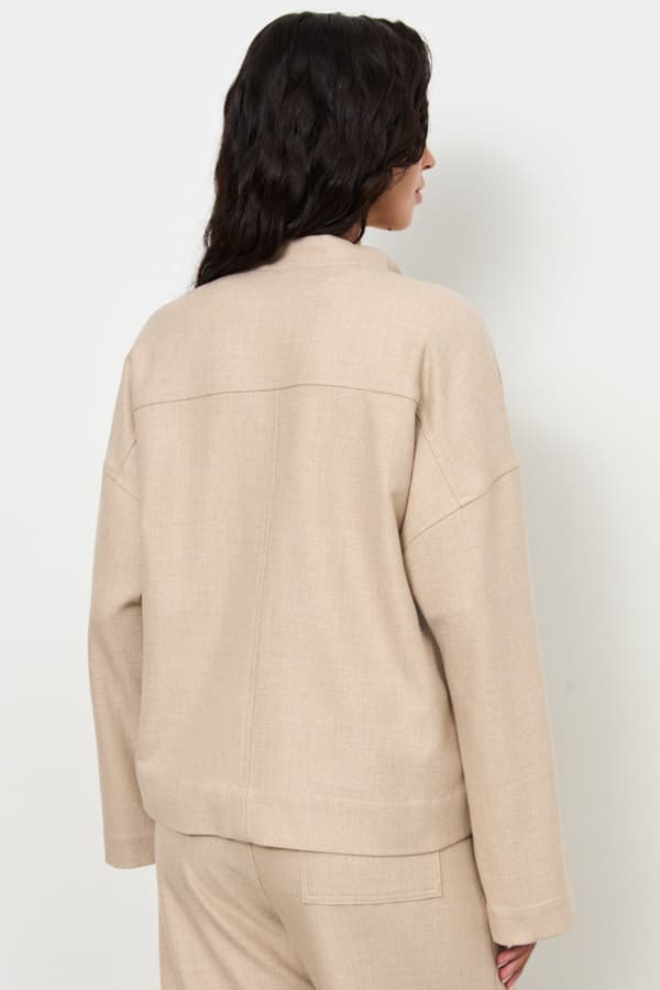 Жакет на молнии из костюмной ткани свободного силуэта. На передней части изделия выполнены накладные карманы с клапанами. Рукав втачной в спущенную пройму. Линия горловины оформлена воротником-стойкой.