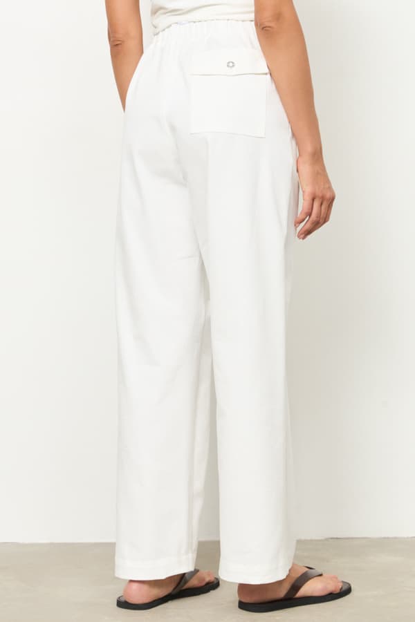 Брюки из хлопковой ткани прямого силуэта с аккуратным разрезом на колене. Пояс с эластичной резинкой и кулиской, в боковых швах карманы. Застёжка на молнию-гульфик и пуговицу. На задней части изделия накладной карман с клапаном.