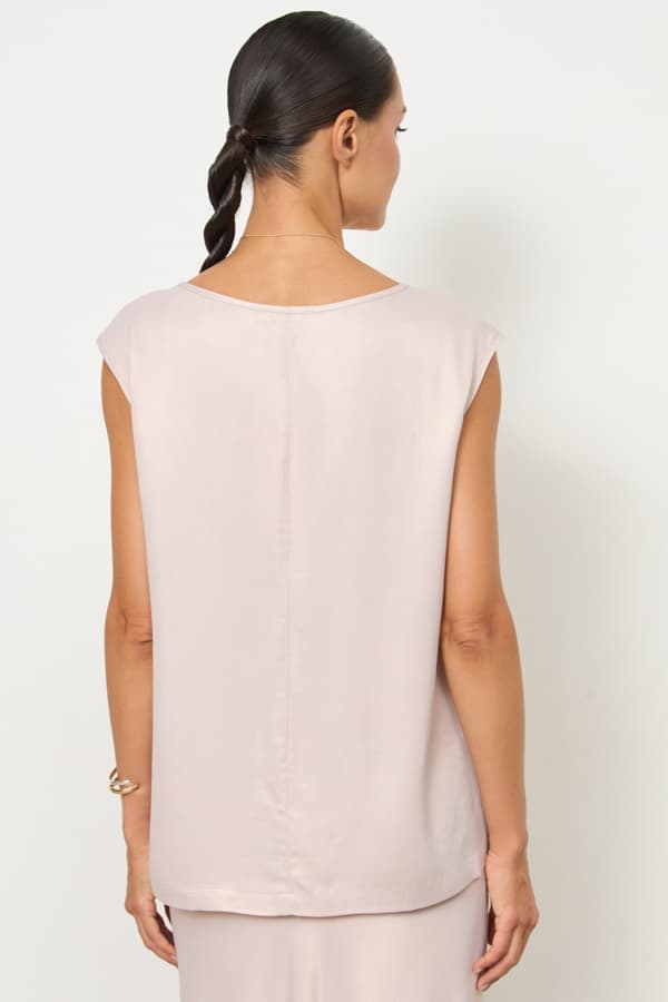 Топ из вискозной ткани с сатиновым блеском. Свободный силуэт с разрезами в боковых швах. Круглый вырез горловины и проймы окантованы косой бейкой из основной ткани.