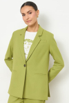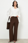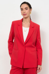 Костюм из эластичного полотна. Брюки прямого силуэта. Пояс с эластичной резинкой. Двубортный жакет прямого силуэта с английским воротником, который визуально делает фигуру стройнее и подчеркивает красивую линию груди. На передней части жакета застёжка на пуговицу и накладные карманы. Рукав втачной, со спущенной линией плеча.