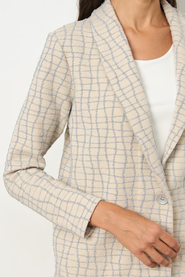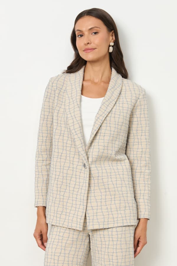 Костюм из эластичного полотна. Брюки прямого силуэта. Пояс с эластичной резинкой. Жакет прямого свободного кроя с женственным шалевым воротником. На передней части изделия застежка на пуговицу. Длинный втачной рукав. Изделие с плечевыми накладками, которые при желании можно убрать.