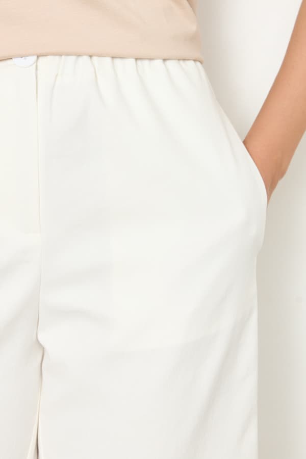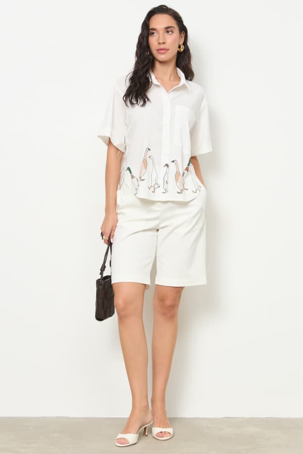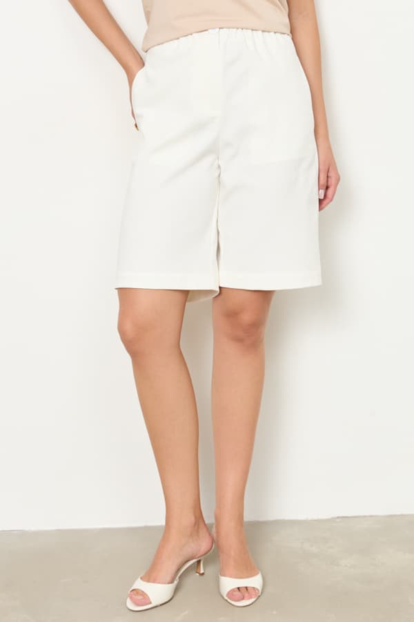 Шорты из хлопковой ткани прямого силуэта. Пояс с эластичной резинкой и кулиской, в боковых швах карманы. Застёжка на молнию-гульфик и пуговицу. На задней части изделия накладной карман с клапаном.