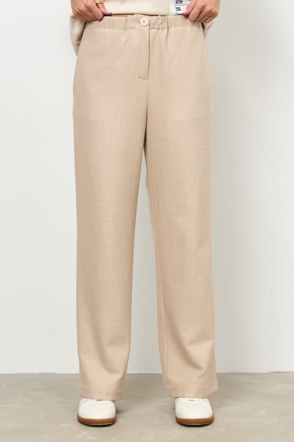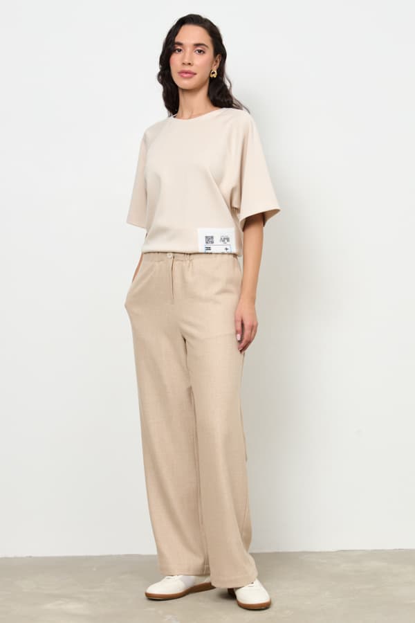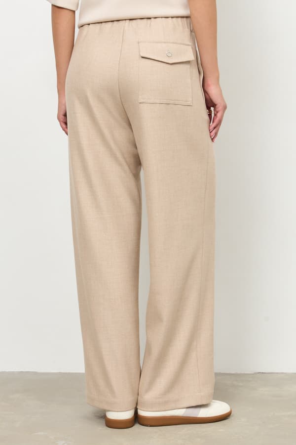 Брюки из костюмной ткани прямого силуэта. Пояс с эластичной резинкой и кулиской, в боковых швах карманы. Застёжка на молнию-гульфик и пуговицу. На задней части изделия накладной карман с клапаном.