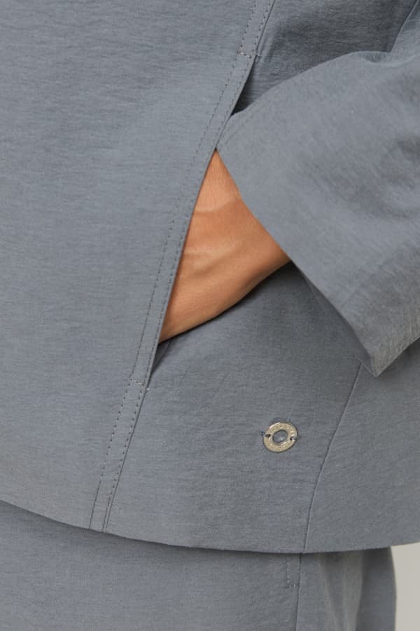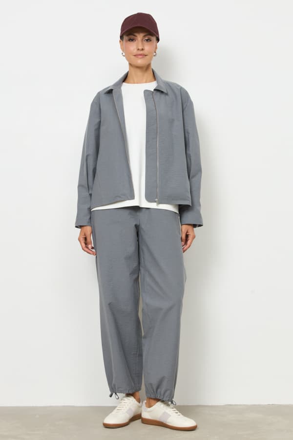 Жакет-бомбер выполнен из фактурного органического хлопка. Свободный силуэт с застёжкой-молнией и карманами в рельефах. Рукав втачной, со спущенным плечом. Нижняя часть рукава - с застроченными складками. Линия горловины оформлена отложным воротником. На задней части изделия выполнена кокетка, по низу изделия - небольшие защипы. Жакет на подкладке.