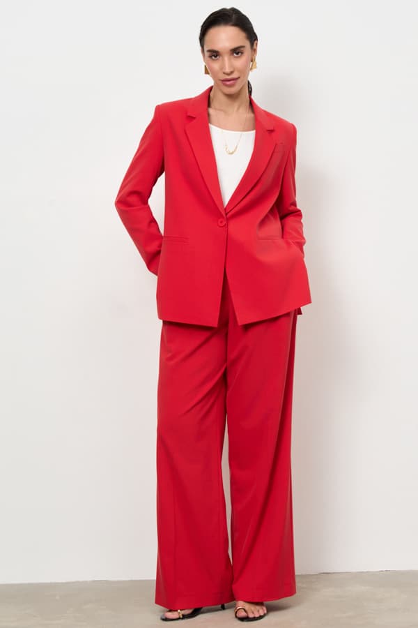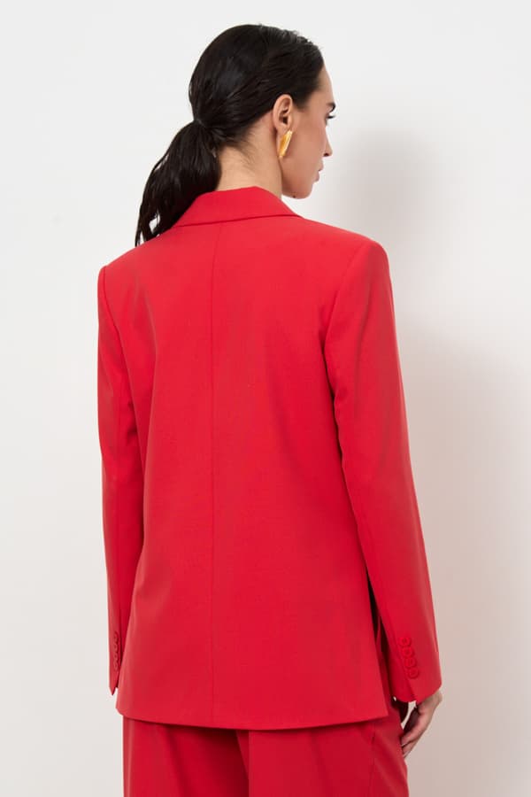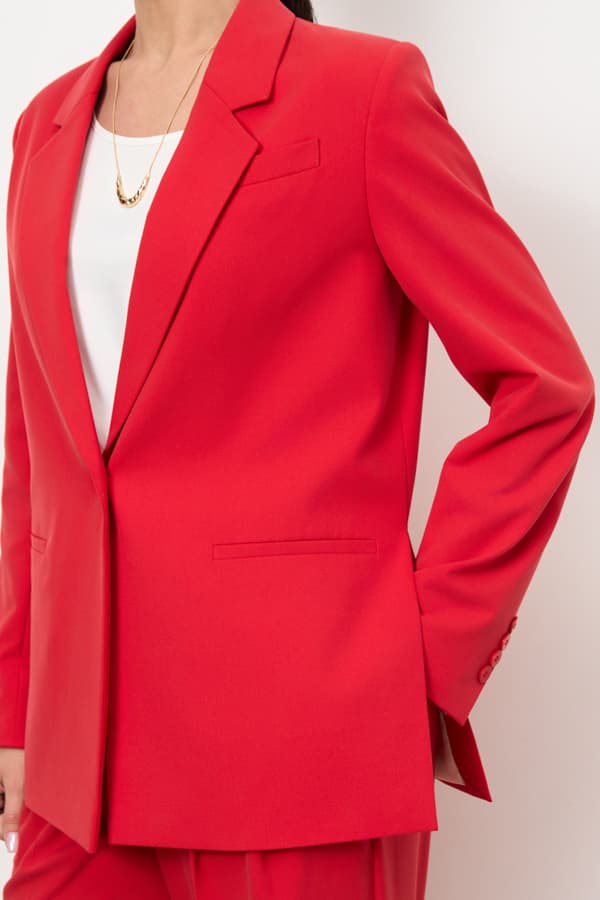 Жакет из костюмной ткани прямого силуэта с разрезами в боковых швах. Изделие с английским воротником и застежкой на пуговицу. На передней части жакета выполнен нагрудный карман с листочкой и карманы в рамку. Втачной длинный рукав, снизу шлица с пуговицами. Изделие идеально держит форму и имеет четкую линию плеча благодаря плечевым накладкам. Жакет на подкладке.