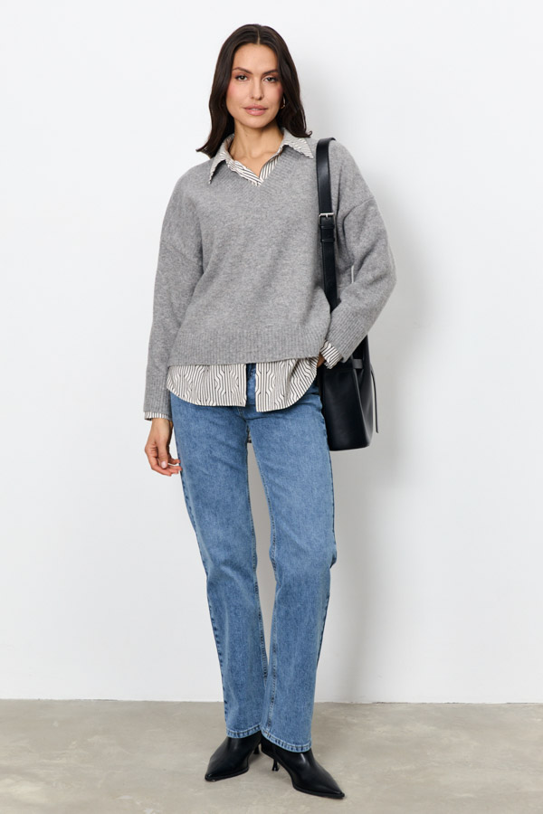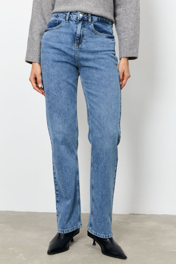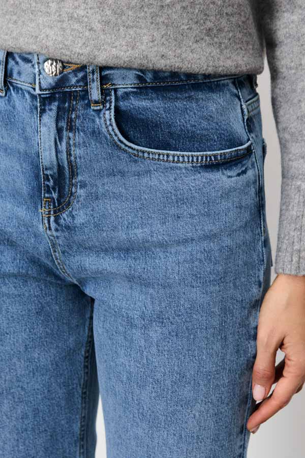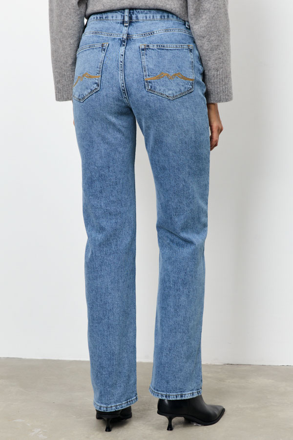 Брюки из эластичного денима выполнены по классической джинсовой технологии (варка с эффектом легкого выбеливания). Прямой классический крой. На задней части брюк выполнены накладные карманы, на передней - карманы с подкройным бочком. Притачной пояс со шлёвками. Застёжка на молнию-гульфик и пуговицу.